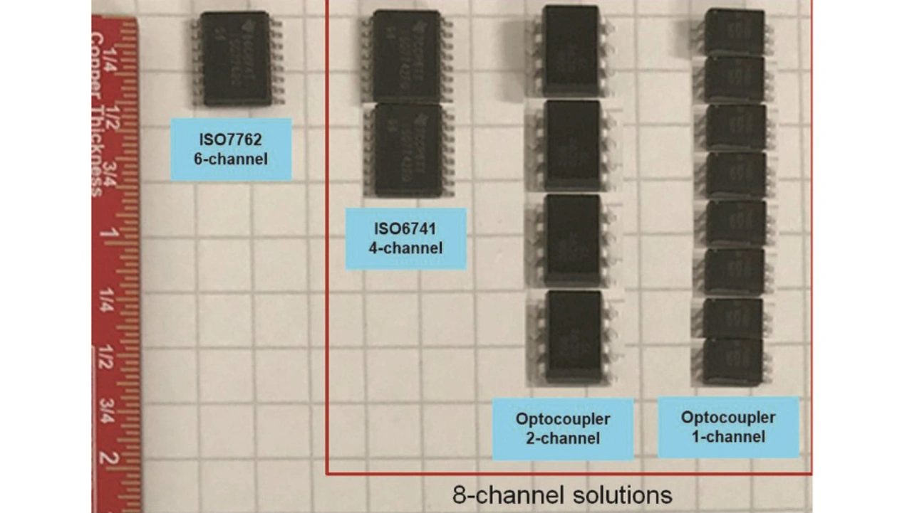 Bild 2 vergleicht den Platzbedarf von acht einkanaligen Optokopplern und vier zweikanaligen Optokopplern mit zwei Digitalisolatoren des Typs ISO6741 zur Realisierung einer achtkanaligen Lösung. Dargestellt ist außerdem der sechskanalige Digitalisolator ISO7762, der es mit seinem Wide-Body-SOIC16-Gehäuse auf die höchste Kanaldichte bringt.