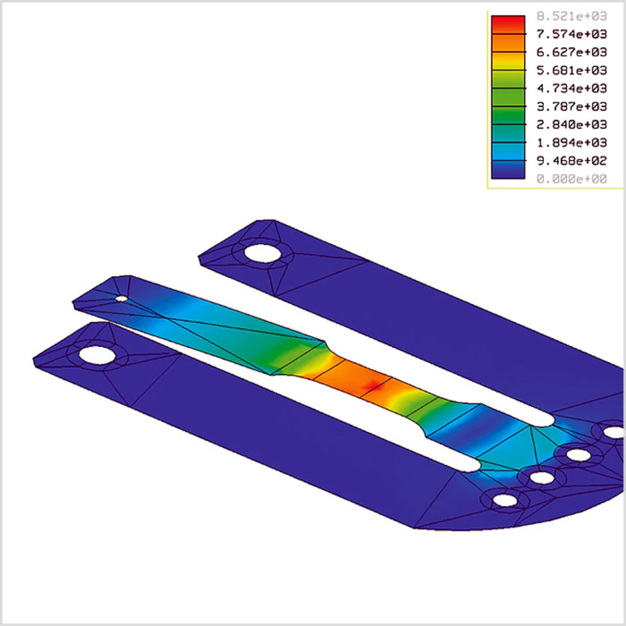 Dehnungsmessstreifen (DMS) werden normalerweise auf metallische Biegebalken geklebt. Geschaltet als Wheatstonesche Brücke erhält man ein der auf dem Biegebalken aufgebrachten Kraft proportionales Signal, angegeben in mV/V bei Nominalkraft. Die auf dem Markt befindlichen Werte liegen zwischen 1 mV/V und 4 mV/V. Das bedeutet, um ein 100%-Signal zu erhalten, benötigt man eine 250- bis 1000-fache Verstärkung. Hohe Verstärkungen verlangen mehr Aufwand mit kleinsten Offset-Driften und haben auch höhere Anforderungen an die EMV. Soll eine strukturierte Leiterplatte zum Einsatz kommen, so wird ein Teil der Leiterplatte aus definiertem FR4 durch Freifräsen zum Biegebalken strukturiert (Bild 3). Mittels Finite-Elemente-Analyse werden die Zonen der größten Belastung für den Widerstandsdruck auf der Oberseite und Unterseite (symmetrischer Aufbau sichert kleinen TK des Signals) definiert (Bild 4). Auf diese Weise lassen sich TKWerte für den Offset von unter 100 ppm/K erreichen. Der TK der Empfindlichkeit liegt unter 30 ppm/K.