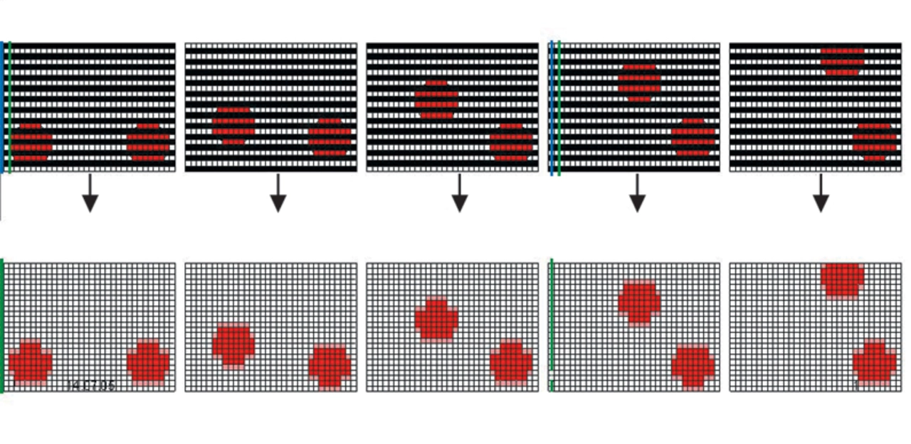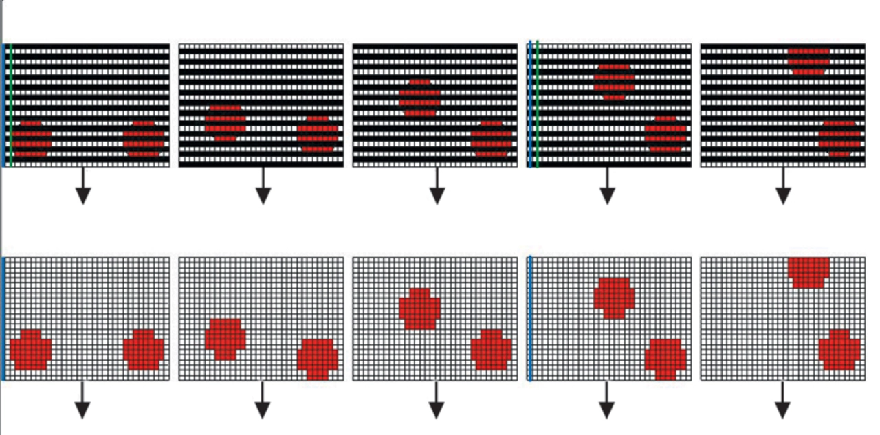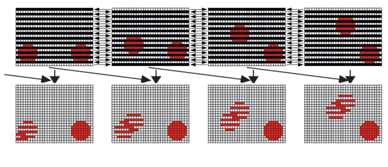 Bild 1. Eine einfache Methode, um die Halbbilder der Fernsehübertragung (oben) in Vollbilder für Flachbildschirme (unten) umzuwandeln, ist die Verdopplung der Zeilen – jede Zeile eines Halbbildes wird zweimal gezeigt.