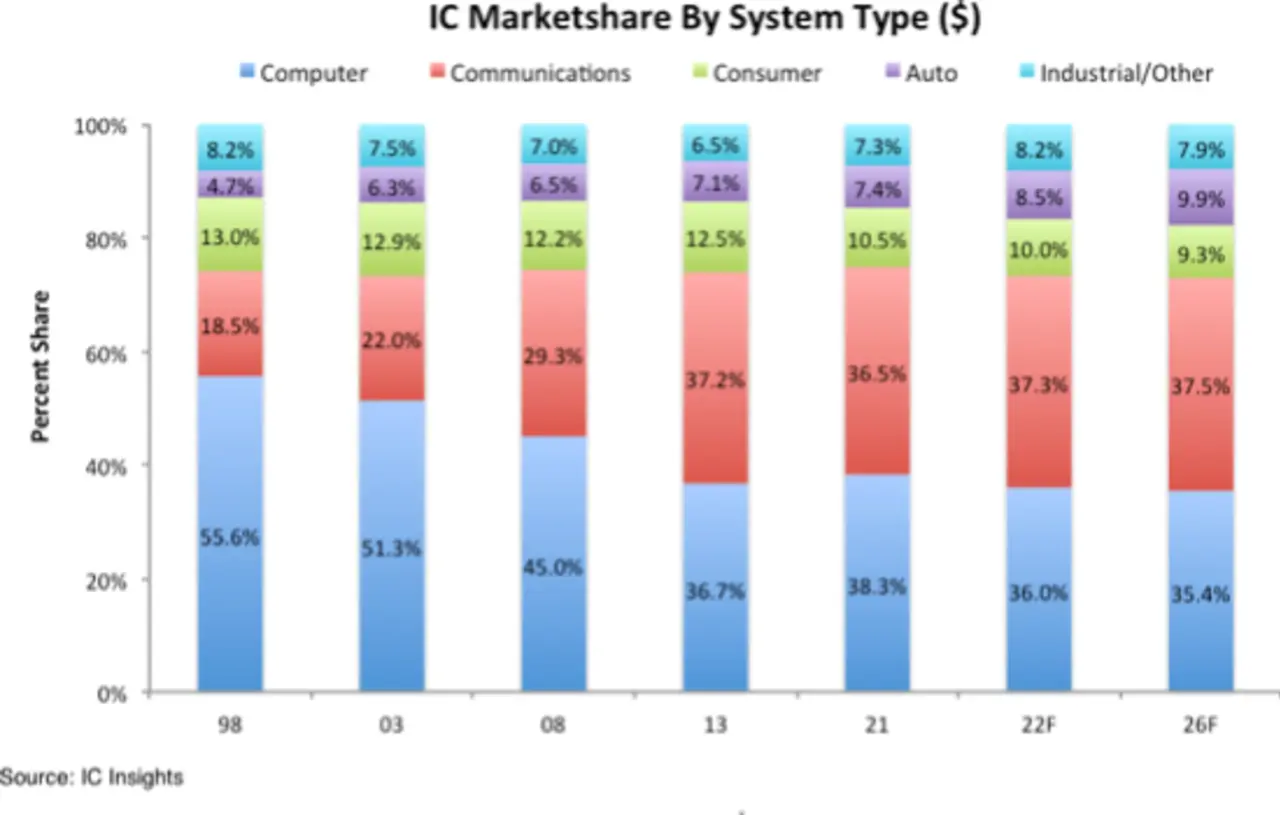 Von 4,7 auf 7,4 Prozent ist der Anteil der Automotive-ICs am IC-Gesamtmarkt zwischen 1998 und 2001 gestiegen. In diesem Jahr wird ihr Anteil auf 8,5 Prozent klettern, bis 2026 sogar auf 9,9 Prozent.