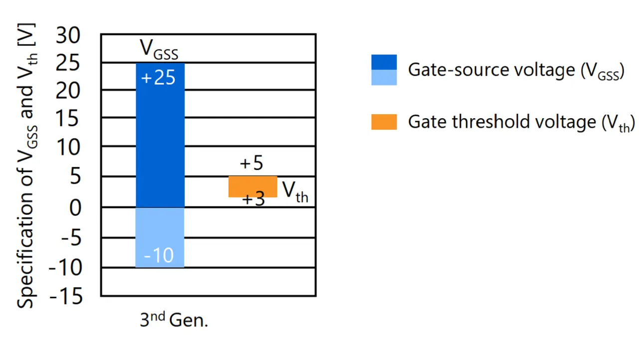 Die TOSHIBA Bauteile der 3. Generation bieten im Bereich der Ansteuerung gleich zwei elementare Vorteile im Vergleich zu Mitbewerbern. Zum einen haben Sie mit -10 bis 25 V den weitesten Gate-Source-Spannungsbereich. Das ermöglicht eine komfortable Reserve bei einem SiC MOSFET üblichen Betrieb von um die 18 V. Zum anderen schützt die geringe Spanne der Schwellspannung Vth vor ungewolltem Schalten.