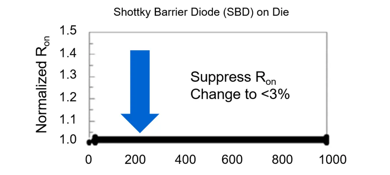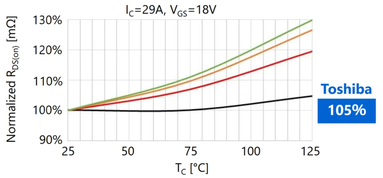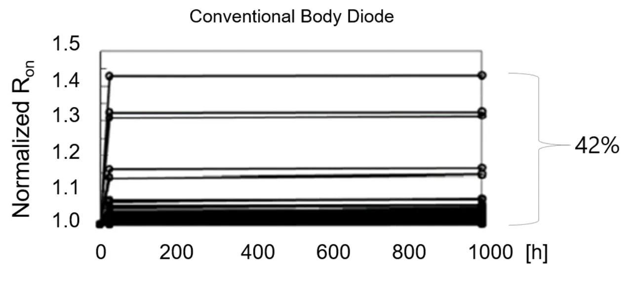 Bei den Derivaten, die die Body-Diode nutzen, kann der RDS(ON) schon nach wenigen Betriebsstunden um mehr als 40 % steigen - Bei den TOSHIBA SiC MOSFETs der 3. Generation beschränkt sich dieser Wert auch nach tausend Stunden auf einen hervorragenden Wert von kleiner 3 %.