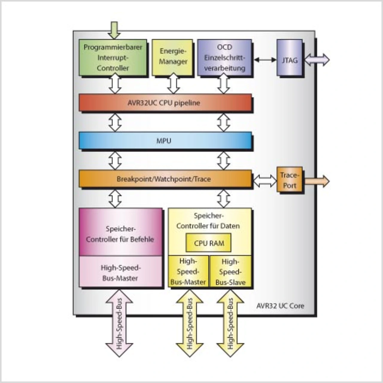 Die AVR32-Architektur von Atmel bietet eine direkte Schnittstelle vom Speicher zur CPU, wodurch der Systembus komplett umgangen werden kann. Dies führt, bedingt durch eine schnellere Befehlsausführung, nicht nur zu einer höheren Rechenleistung, sondern auch zu einem niedrigeren Energieverbrauch als bei vergleichbaren MCUs.