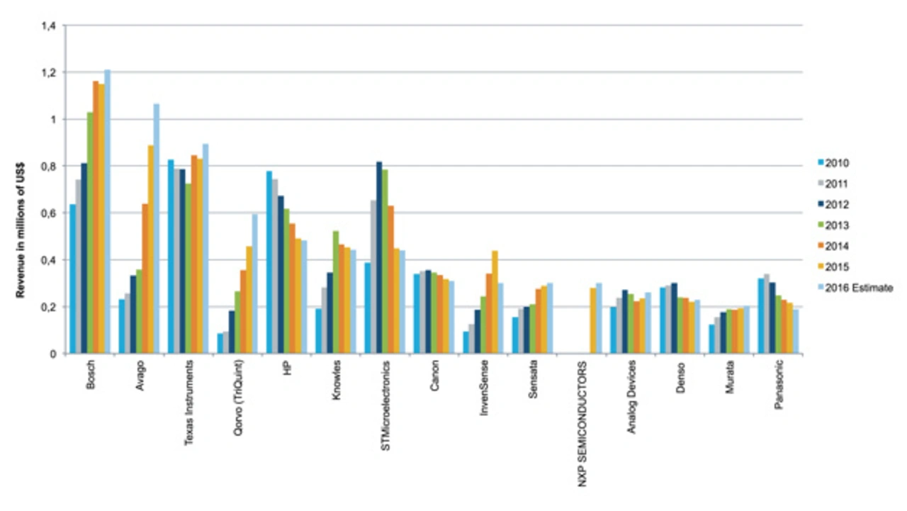 Ein wichtiger Wachstumstreiber 2017 wird der wachsende Bedarf an BAW-Filtern sein. 4G stellt für die BAW-Filter-Hersteller wie Avago (jetzt Broadcom) und Qorvo (früher TriQuint) eine hervorragende Wachstumschance dar. Je mehr Frequenzbänder die Smartphones unterstützen müssen, desto höher ist die Zahl der benötigten BAW-Filter. Zudem haben einige 4G-Bänder ihre Anforderungen an die Steilheit der Filterkurven verschärft. Sie zu erfüllen, ist mit SAW-Filtern nicht mehr möglich – ein zusätzlicher Schub für BAW-Filter-Hersteller. Avago und Qorvo ist es zudem gelungen, in Bereichen, die nur durch BAW-Filter bedient werden können, die Preiserosion gering und ihre Margen hoch zu halten. In einem iPhone sind aktuell mehr als 20 BAW-Filter im Einsatz. Das sind mehrere Dollar, und damit mehr, als die im iPhone verwendeten Bewegungs- und Drucksensoren zusammen wert sind.