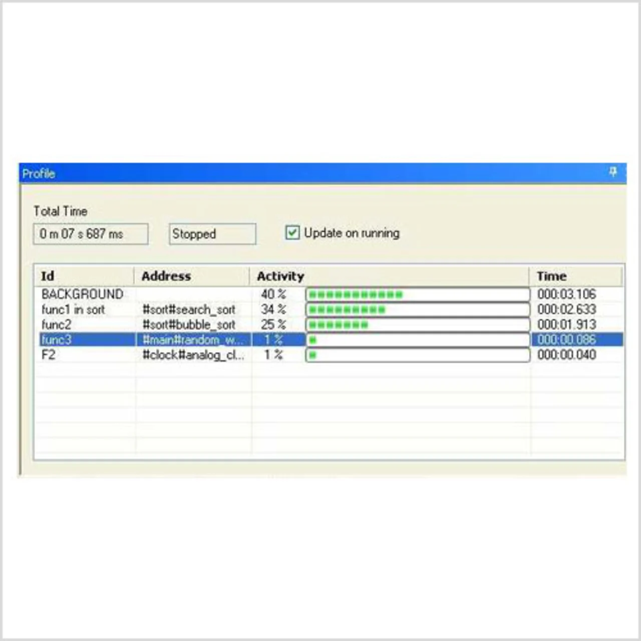 Gerade bei Anwendungen mit großem Echtzeit-Einfluss ist die Sicherheit der Performance-Reserve sehr wichtig. Hier können detaillierte Zeitmessungen der Interrupt-Service-Routinen helfen. In fast allen Fällen reicht aber auch eine statistische Messung aus. Dies geschieht mit der „Execute Profile“-Methode. Hier werden zyklisch Werte über den Serial Wire Viewer ausgegeben und analysiert. Das Ergebnis ist eine Auswertung, die zeigt, welche der zu untersuchenden Funktionen (oder Code-Bereiche) wie viel CPU-Zeit erforden (Bild 3). Neben der Performance-Sicherheit kann diese Analyse auch zur gezielten Optimierung der Funktionen eingesetzt werden, die viel CPU-Zeit benötigen.