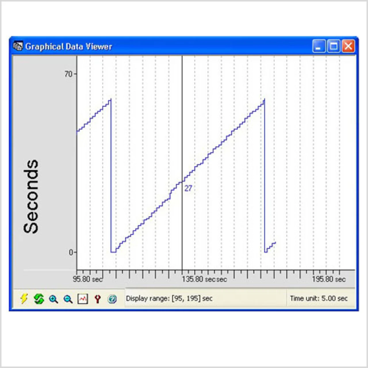 Ein anderer Anwendungsfall ist die Überwachung von Variablen, z.B. solche, die kritische Applikationszustände anzeigen, bestimmte Werte nicht über- oder unterschreiten dürfen oder evtl. auch mit einem A/D-Wandler gemessene Analogwerte. Auch hier wird die Adresse als Trace-Filter definiert. Insbesondere bei Analogwerten ist hier die grafische Anzeige sehr übersichtlich (Bild 2).