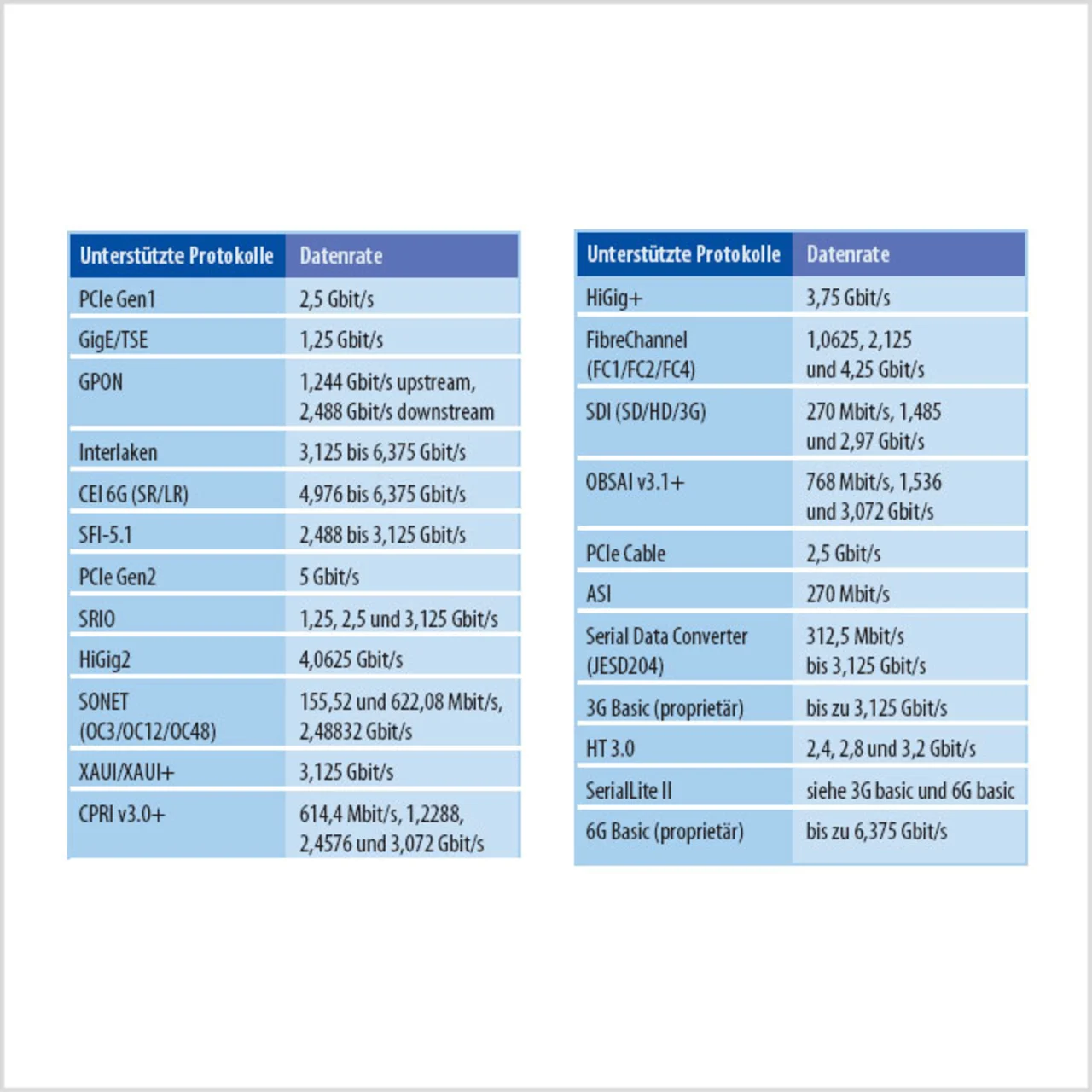 Die Datenraten für I/O-Bauelemente haben sich zuletzt etwa alle zwei bis drei Jahre verdoppelt. Derzeit arbeiten Transceiver für anspruchsvolle serielle Protokolle mit 5 bis 6 Gbit/s. Beispiele dafür sind CEI/OIF 6G und 2x XAUI (6,25 Gbit/s) für die Netzwerk-Kommunikation, PCIe 2.0 (5 Gbit/s) für Computer-I/O-Busse und SATA III/ SAS II (6 Gbit/s) für Speichernetzwerke. Auf Basis der neuesten 40-nm-Technologie bietet die Core-Logik der Stratix-IV-GX-FPGAs bis zu 530 K Logikelemente (LEs). Diese Bausteine enthalten bis zu 48 CDR-basierte Vollduplex-Transceiver: 32 davon für maximal 8,5 Gbit/s und 16 für maximal 3,2 Gbit/s, was einer System-Übertragungsrate von knapp 310 Gbit/s entspricht. Neben der Unterstützung für die gängigsten schnellen I/O-Protokolle bieten die Stratix-IV-GX-Schaltkreise spezielle Hardware und IP-Funktionen für neue Protokolle wie PCIe 2.0, HT 3.0, Interlaken, CPRI und SFI-5. In der Tabelle sind alle unterstützten Protokolle zusammengefasst.