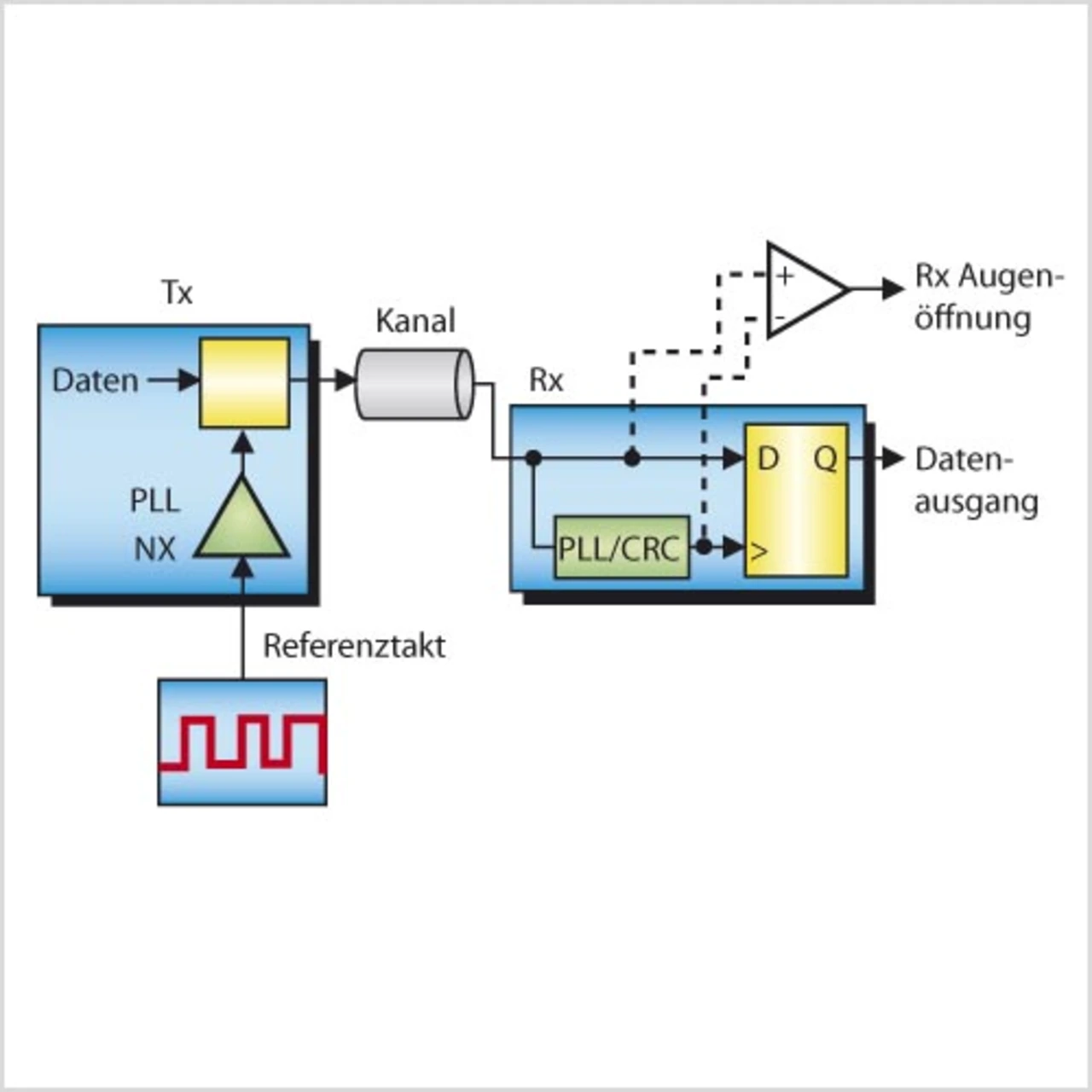 Konventionelle schnelle Datenübertragung (Bild 1) benötigt auf der Empfängerseite sehr präzise CDR-Schaltungen (Clock and Data Recovery), um den Takt aus den übertragenen Daten zurück zu gewinnen. Dies wird in aller Regel mit PLL-, Phasen-Detektor-, Filter- und VCO-Schaltungen realisiert. Die Herausforderung besteht darin, eine möglichst geringe BER (Fehlerquote, Bit Error Ratio) zu erreichen. Die BER hängt von der Qualität des Eingangssignals und vom Jitter/ Rausch-Verhalten der CDR-Schaltung ab.