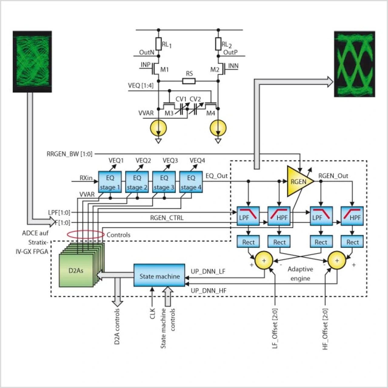 Die erforderliche Equalization hängt von vielen Parametern ab wie Backplane-Länge und -Material, Datenrate, Daten-Muster, Alterung, Prozess, Spannung und Temperatur. Die ADCE überwacht dazu die Ausgänge der Equalizer-Stufen und gleicht die Einstellung für mehr oder weniger Entzerrung ab (Bild 4).
