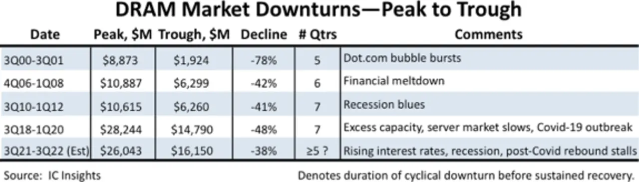 Die Geschichte lehrt: Tritt der DRAM-Markt in einen Abschwung ein, so fällt er schnell und landet hart. Seit 2000 erstreckte sich jeder Abschwung über mindestens fünf Quartale. Der DRAM-Markt schrumpfte während eines solchen Down-Zyklus um mindestens 41 Prozent. IC Insights geht davon aus, dass der DRAM-Umsatz im dritten Quartal 2022 um 38 Prozent unter dem Spitzenumsatz im dritten Quartal 2021 liegt. Der DRAM-Markt werde im vierten Quartal weiter schrumpfen und sich auch Anfang 2023 noch nicht erholen.