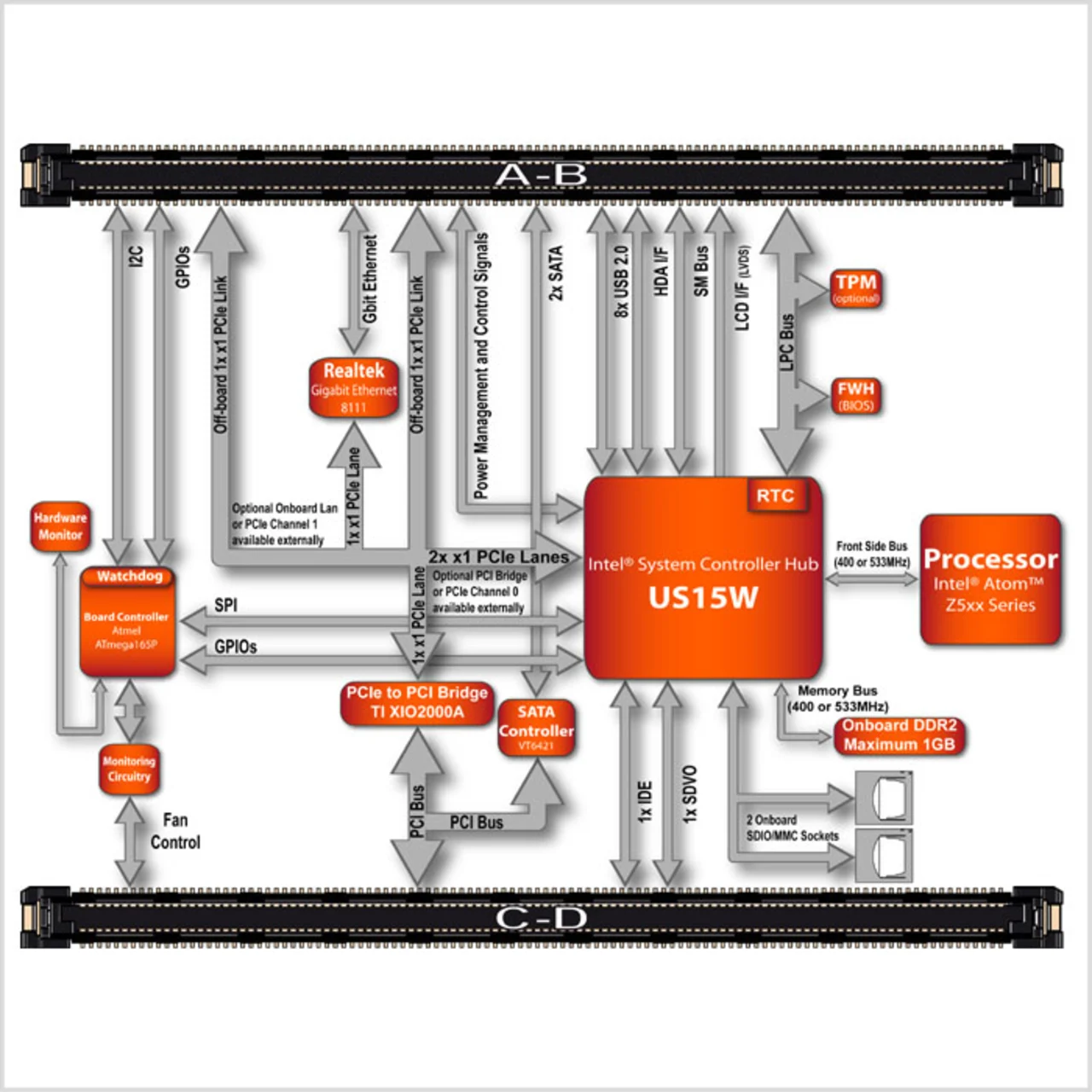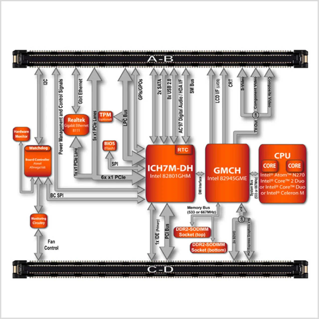 Der 945GSE ist eine etwas abgespeckte Version des in der Industrie weit verbreiteten 945GME-Chipsatzes mit nur einem Speicherkanal. Zur Komplettierung des Chipsatzes kommen South-Bridges der ICH7-Serie zum Einsatz.