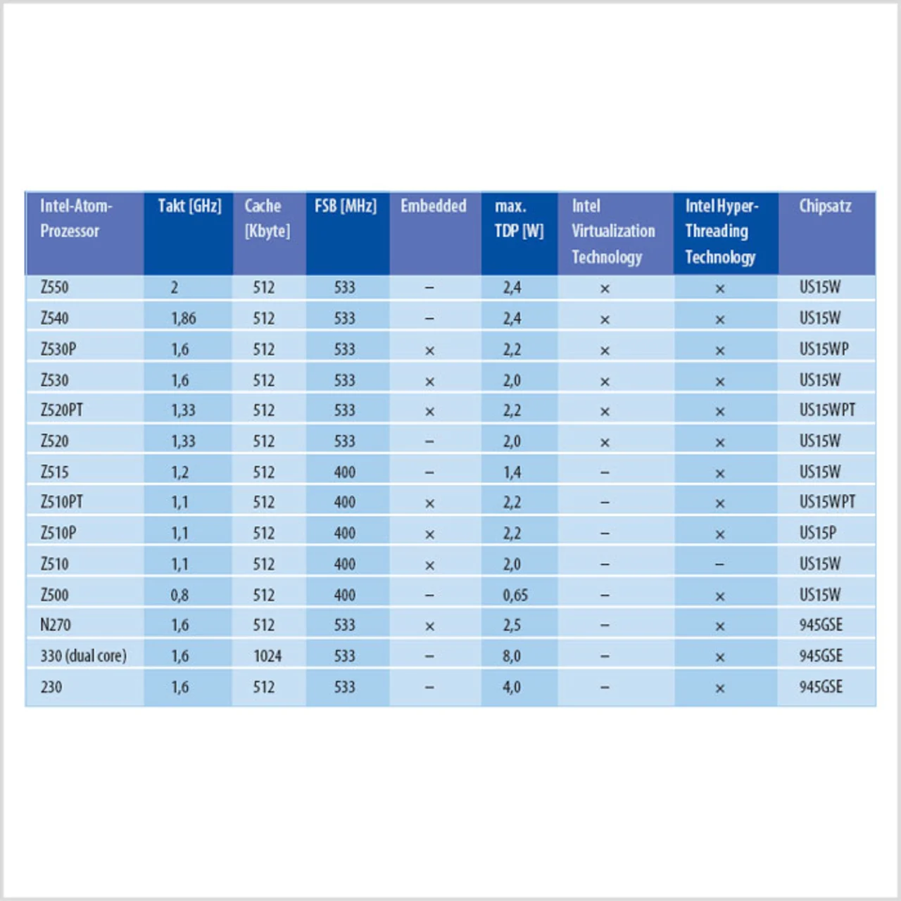 Ein Blick auf den maximalen Leistungsbedarf zeigt, dass nicht alle Atom-Prozessoren gleich stromsparend sind. Der Bereich erstreckt sich von 0,65 Watt bis hin zu 8 Watt bei der Dual-Core-Version. Aber auch beim Funktionsumfang gibt es erhebliche Unterschiede. Wenn auf einem System zwei unterschiedliche Betriebssysteme zum Einsatz kommen sollten, eignen sich die Versionen ab dem Z520, da nur diese den Intel-Virtualisierungs-Support bieten. Diese Technik wird gerne in der Automatisierungstechnik angewandt, wenn Echtzeit-Steuerung und das Benutzer-Interface auf zwei unterschiedlichen Betriebssystemen implementiert werden.
