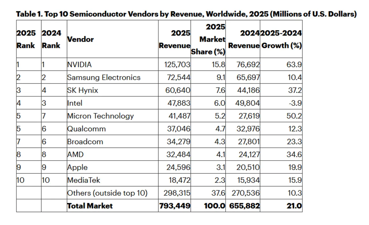 Nvidia konnte seinen Vorsprung gegenüber Samsung im Jahr 2025 um 53 Mrd. Dollar ausbauen. Das Unternehmen war der erste Anbieter, der einen Halbleiterumsatz von 100 Mrd. Dollar überschritten hat und damit über 35 Prozent zum Branchenwachstum im Jahr 2025 beitrug.