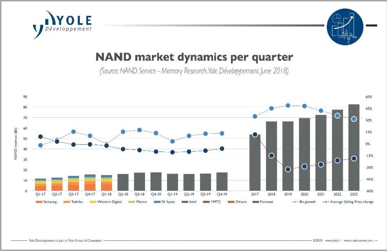 Parallel dazu wird erwartet, dass der NAND-Markt im Jahr 2018 einen weiteren Umsatzrekord aufstellen wird, bevor er 2019 flach wird. Die Wettbewerbslandschaft von NAND bleibt unglaublich dynamisch. Samsung bereitet seine erste Fabrik an seinem Standort Pyeongtaek vor; Intel entwickelt sich zu einem eigenständigen Anbieter mit Kapazitäten in China; und der Verkauf von Toshibas Speichergeschäft an ein von Bain Capital geführtes Konsortium findet endlich statt. Inzwischen zeichnet sich ein Neuzugang ab: Die chinesische Yangtze Memory Technologies Co. (YMTC), die den Status quo zu stören droht.