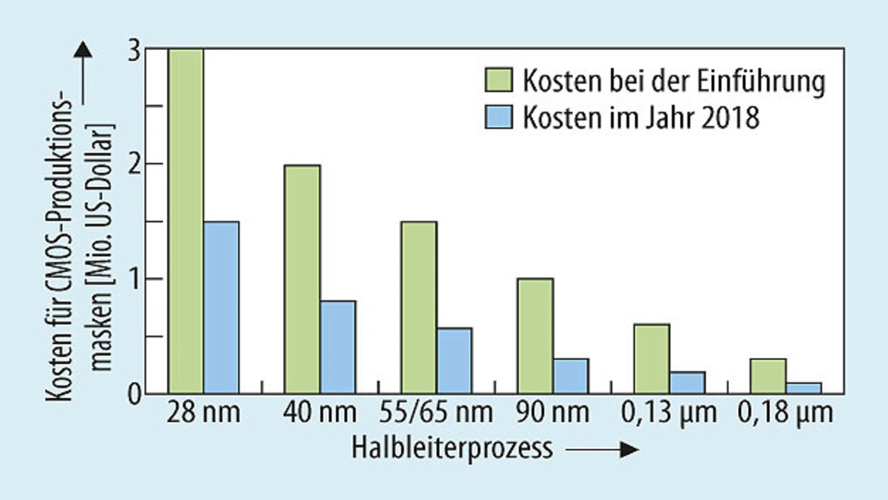 Zur Verdeutlichung: Die Kosten für einen CMOS-Produktionsmaskensatz liegen in der Größenordnung von 1,5 Mio. US-Dollar bei 28 nm; 0,8 Mio. US-Dollar bei 40 nm; 0,5 Mio. US-Dollar bei 55/65 nm und sinken für 180 nm sogar auf unter 100.000 US-Dollar (Bild 2).