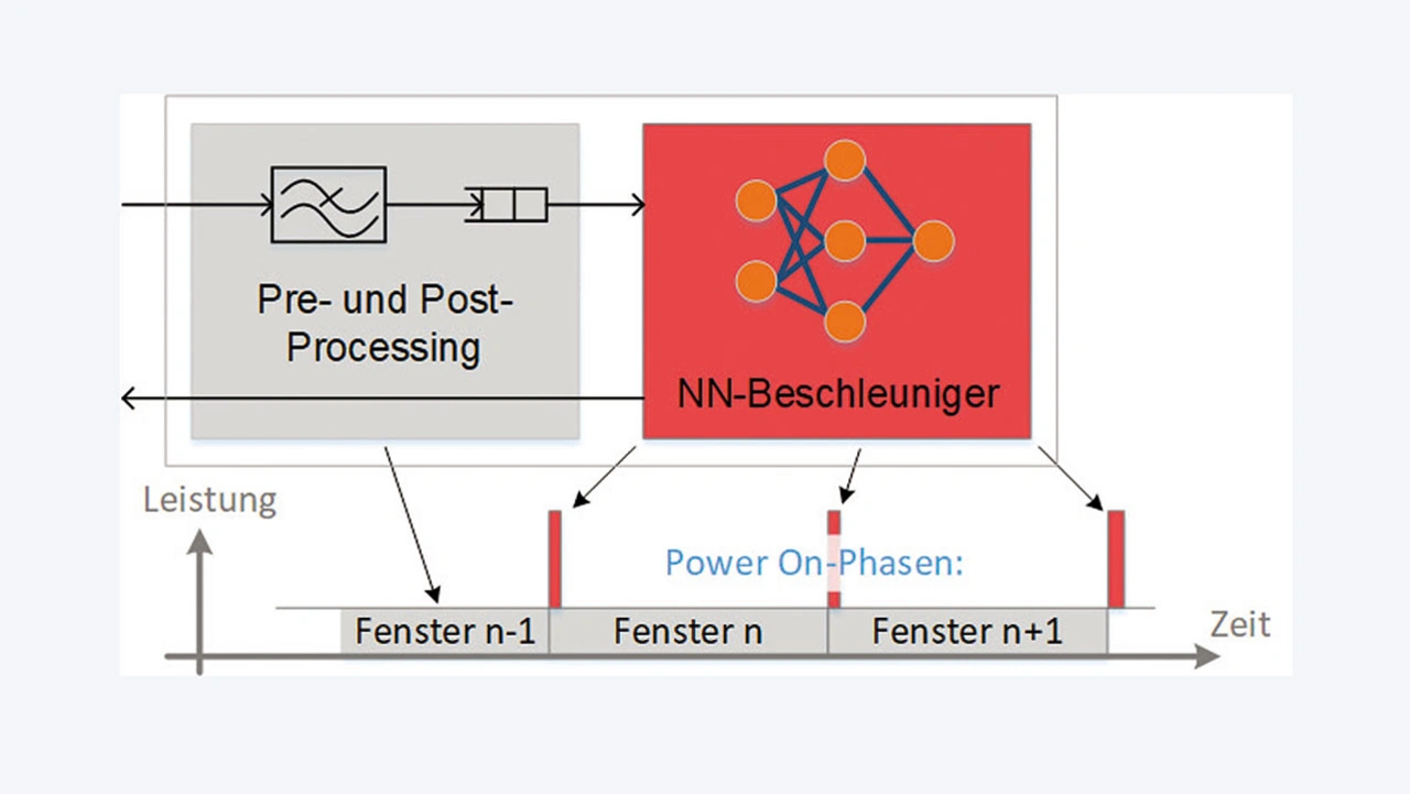 Zur Analyse von EKG-Daten ist die Betrachtung von Signalen ausreichender Länge erforderlich, weshalb jede zweiminütige EKG-Aufnahme in neun Fenster zu je 12,7 s unterteilt wird. Zunächst reduziert eine Bandpass-Filterung mit Down-Sampling die Datenrate im Preprocessing. Die neuronale Verarbeitung kann entsprechend dieser Datenratenreduktion deutlich langsamer erfolgen als die Eingabe. Dies wird zum Energiesparen genutzt, indem der NN-Beschleuniger zeitweise schlafengelegt wird.