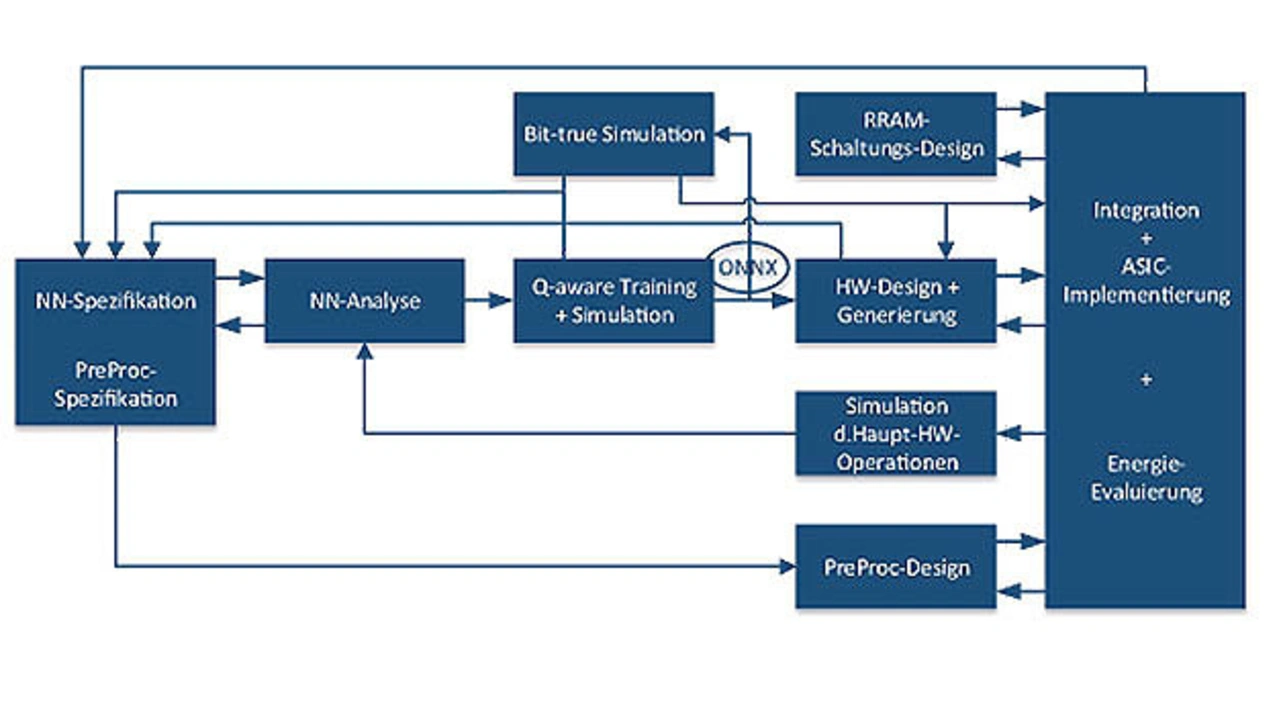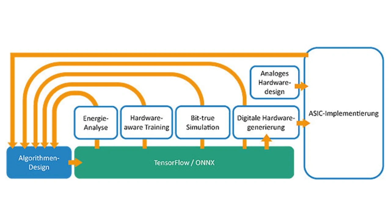 Wie die verschiedenen Aspekte, Entwurfsschritte und Aufgaben im Entwurfsablauf (siehe Bild 3) ineinandergreifen, ist in Bild 4 dargestellt. Genau deshalb wurde ein hochgradig iterativer Prozess gewählt. So wurden zur Vorbereitung des Entwicklungsprozesses erste NNs und ASICs als »Pipe-Cleaner« erstellt, diese genau auf ihre Schwachpunkte u.a. hinsichtlich ihrer Energieaufnahme untersucht und damit gezielt Verbesserungen eingebracht.