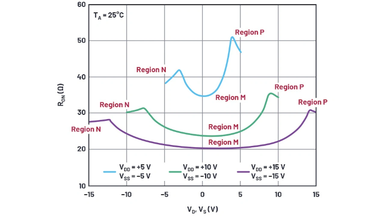 Die M-Regionen (Bild 1) befinden sich in der Mitte der N- und P-Regionen, in welcher der NMOS- und der PMOSFET parallel arbeiten, aber je nach dem analogen Signalpegel zwischen den Versorgungen einen unterschiedlichen Ein-Widerstand aufweisen.