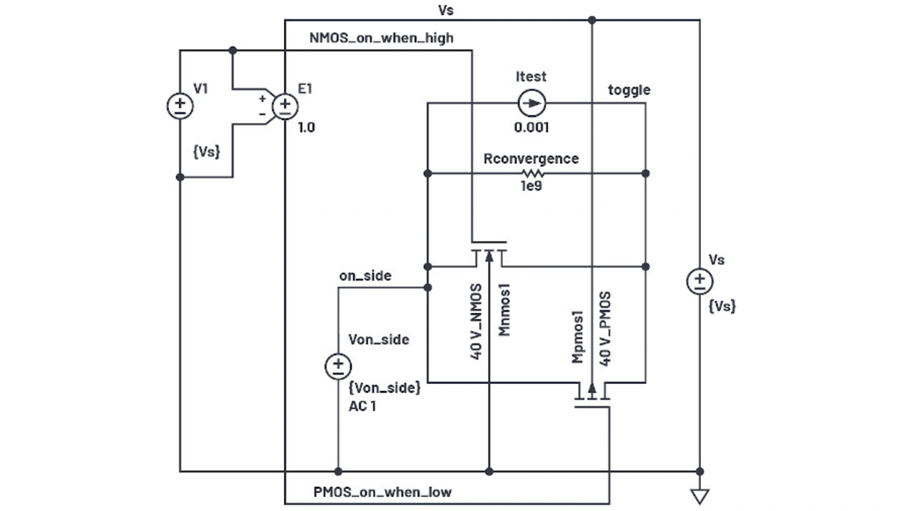 Ausgangspunkt für das neue Modell ist die in Bild 2 gezeigte LTspice-Testschaltung. Zu beachten ist, dass die Parameter RDN und RDP, die parasitären Drain-Widerstände, einen eher moderaten Wert haben. Wird zum Beispiel ein Wert von 1 µ genommen, führt dies zu einer langsamen Konvergenz der Simulation. Ein RDN-Wert von 1 dagegen ermöglicht eine angemessene Simulationsgeschwindigkeit. Das Hinzufügen eines Widerstandes RKonvergenz hat das Simulationsrauschen und die Simulationsgeschwindigkeit verbessert, indem dem Umschaltknoten eine konvergenzfähige Leitfähigkeit verliehen wurde. Für die Messung des Ein-Widerstands wurde eine potentialfreie Stromquelle getestet.