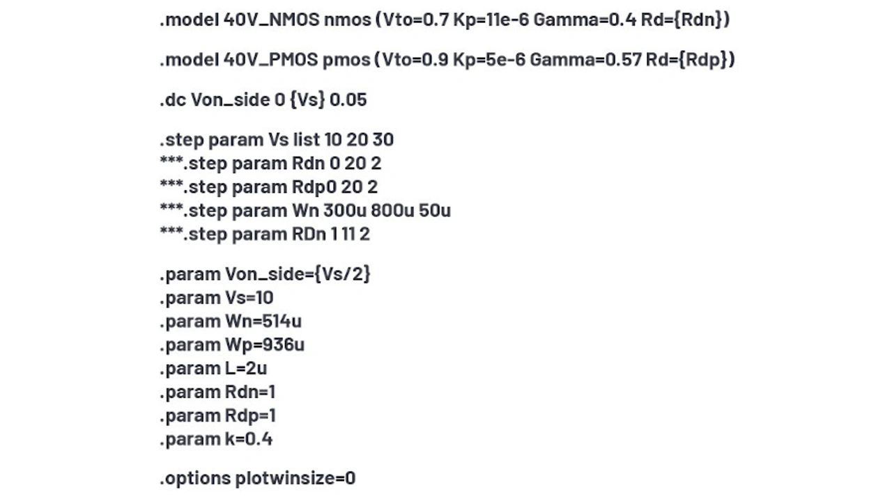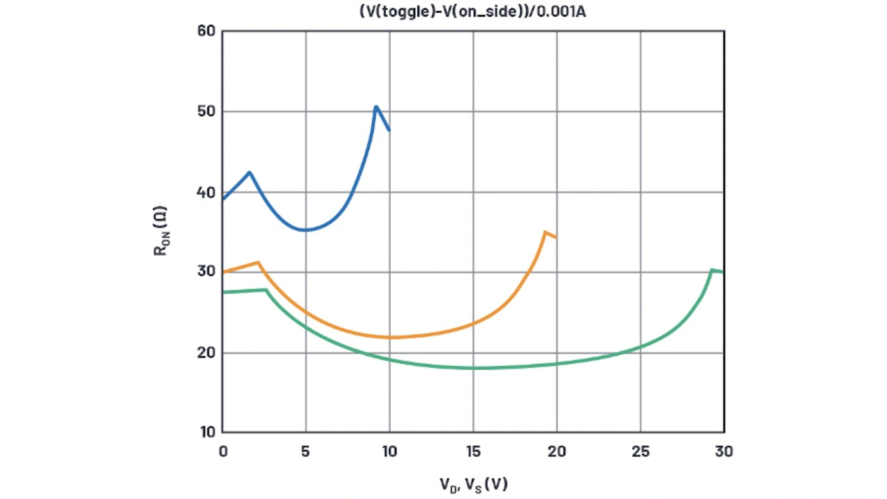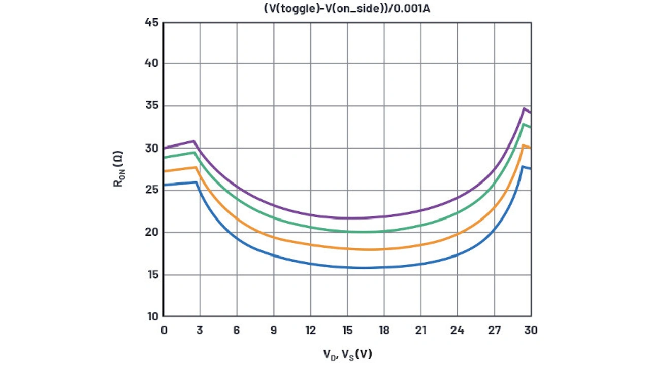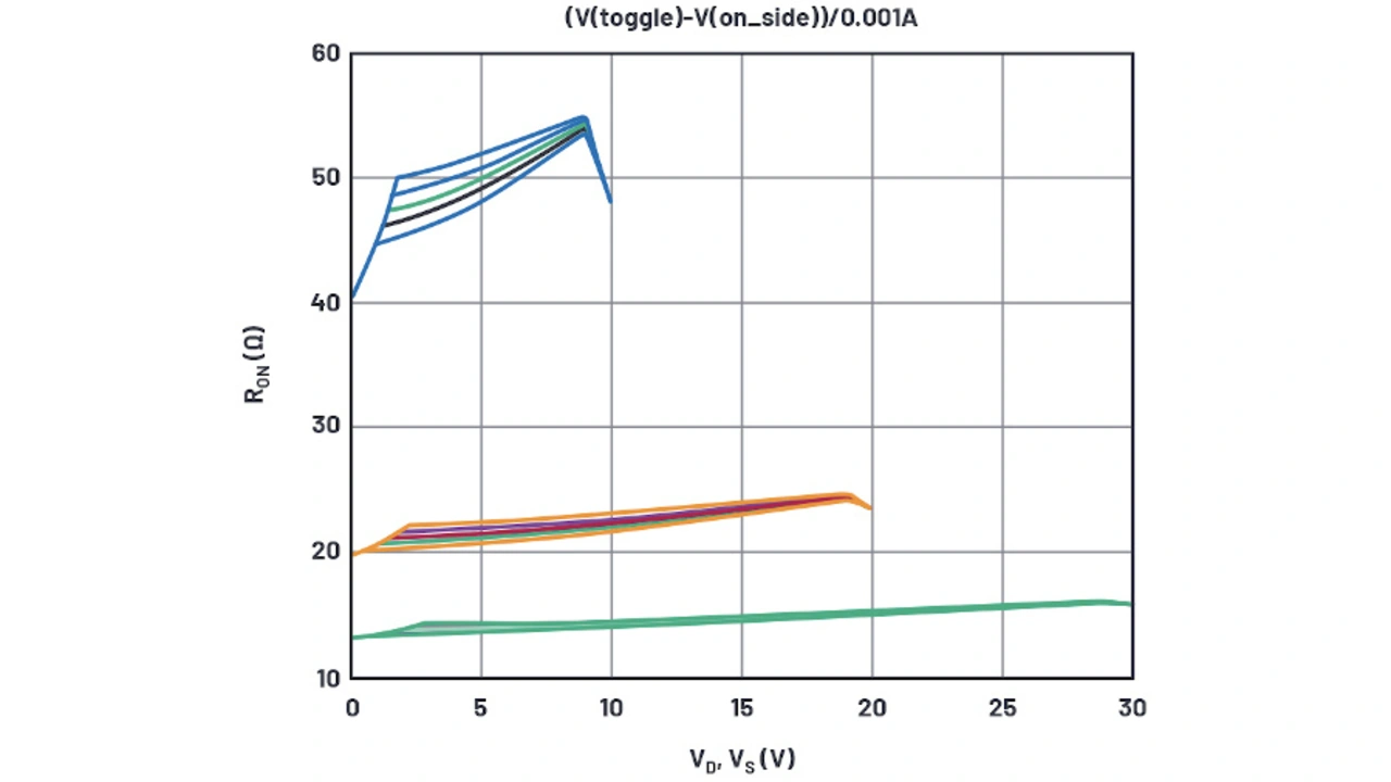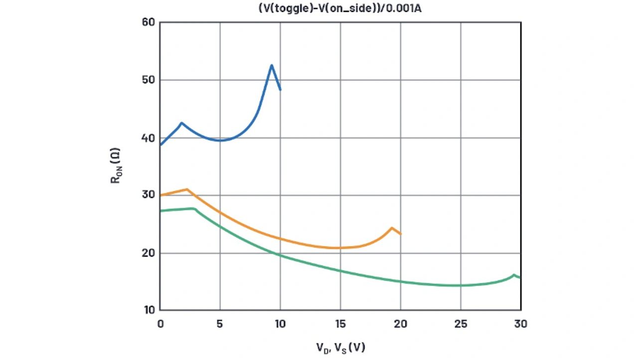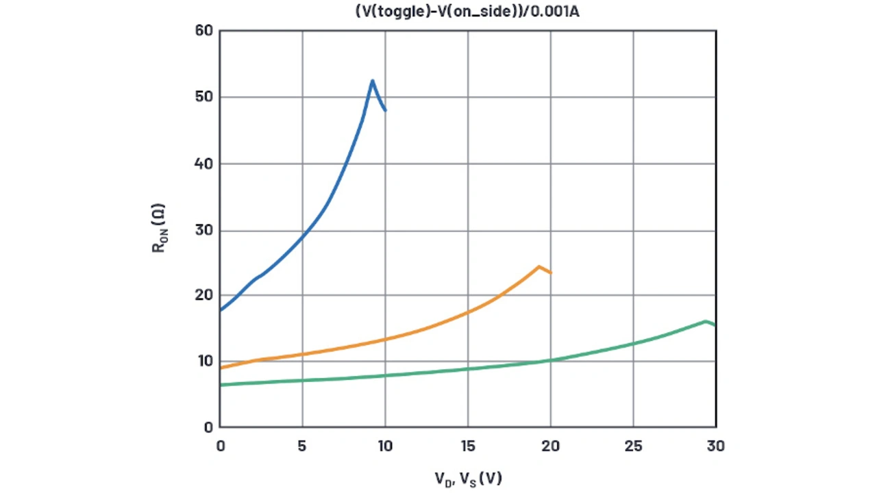 Zwar repräsentieren die 10 V-Kurven in Bild 4 die Datenblattkurve an den Extrema der Versorgungsspannung, die Simulation ergibt jedoch einen zu niedrigen REin für die 20-V- und 30-V-Kurven. Die Ein-Widerstände entsprechen RDS,Ein(NMOS) + RD(NMOS) im Bereich nahe der positiven Versorgungsspannung und RDS,Ein(PMOS) + RD(PMOS) im Bereich nahe der positiven Versorgungsspannung. Bei hohen Versorgungsspannungen ist der Parameter RD signifikanter als W/L, wogegen bei niedrigen Versorgungsspannungen W/L dominiert. Hier muss mit zwei Variablen jongliert werden, was zu mühsam ist. Es ist festzustellen, dass sich der REin-Wert mit der Versorgungsspannung ändert, weil der NMOSFET variabel angereichert wird, der RD-Wert sich jedoch nicht mit der Versorgungsspannung ändert – bei Drains mit Drift-Regionen tut er dies wahrscheinlich doch, aber das Modell soll hier einfach gehalten werden.