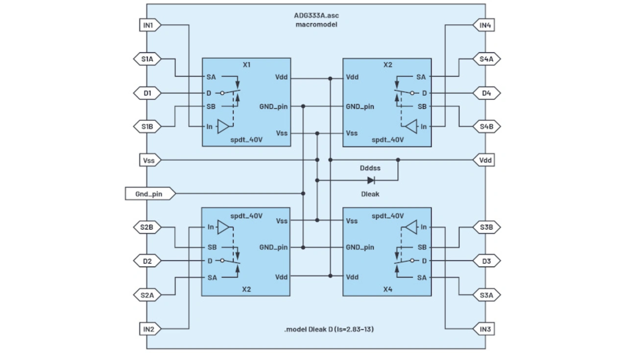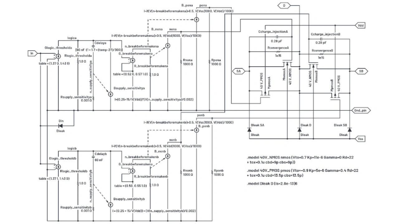 Verfügbare Simulationsmodelle für Analogschalter berücksichtigen nicht das Temperaturverhalten und sind nur für eine bestimmte Versorgungsspannungen definiert. Wer ihr Spannungs- und Temperaturverhalten simulieren will, muss selbst ein Makromodell erstellen – auf der Basis einfachster Modelle.