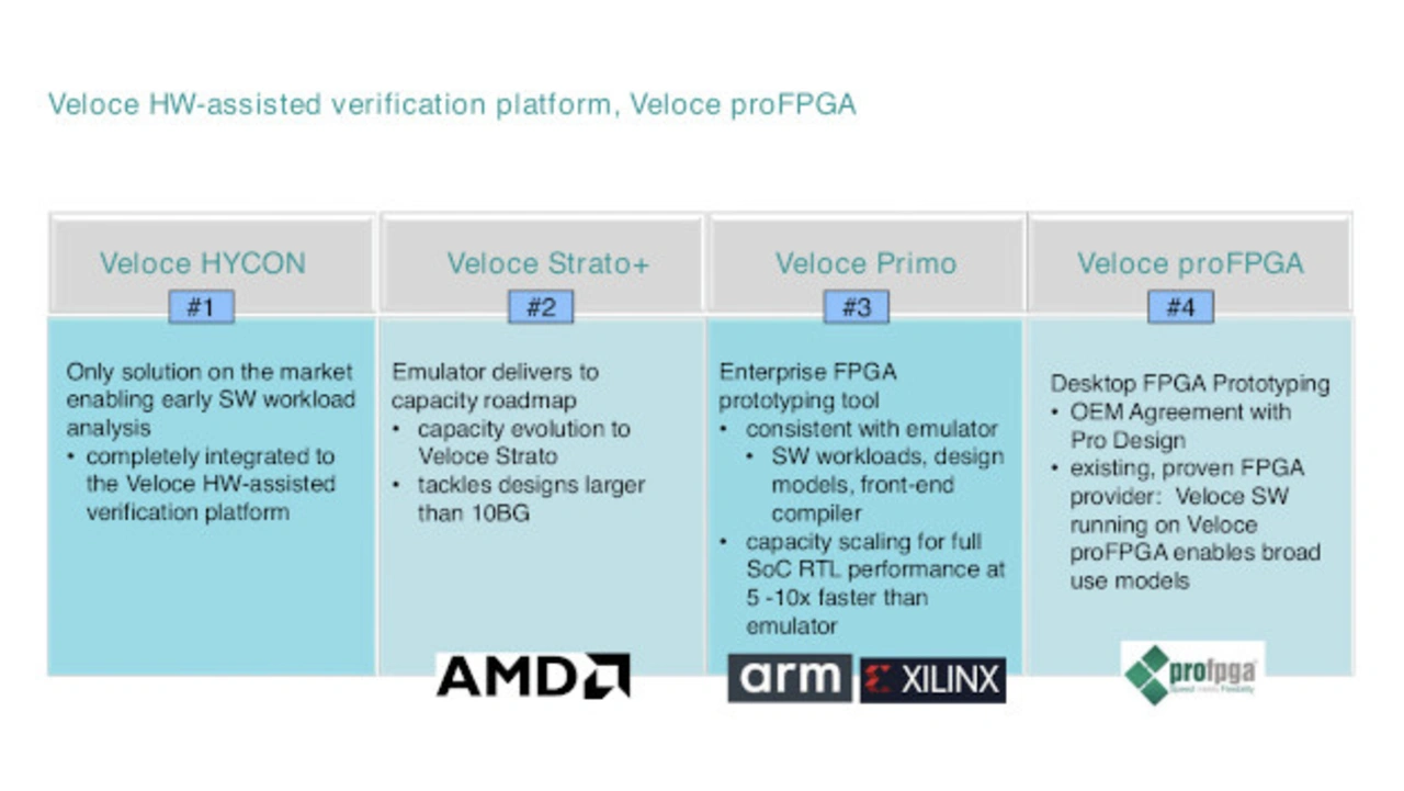 Veloce proFPGA ist eine bewährte Desktop-Plattform, die von Pro Design (OEM) für das hardwaregestützte Verifikationssystem Veloce übernommen wurde. Sie ist modular konzipiert, für eine Kapazität von 40 M Gattern bis 800 M Gattern, und basiert auf High-End-FPGAs einschließlich Stratix 10 GX 10M von Intel und Virtex UltraScale+ VU19P von Xilinx.