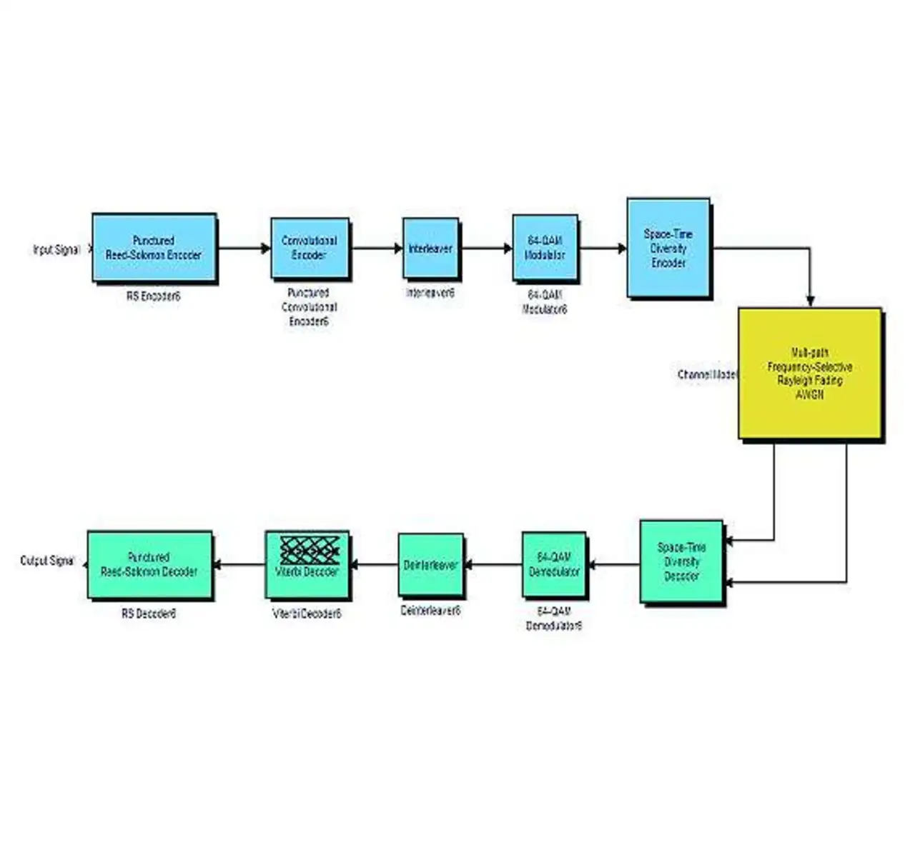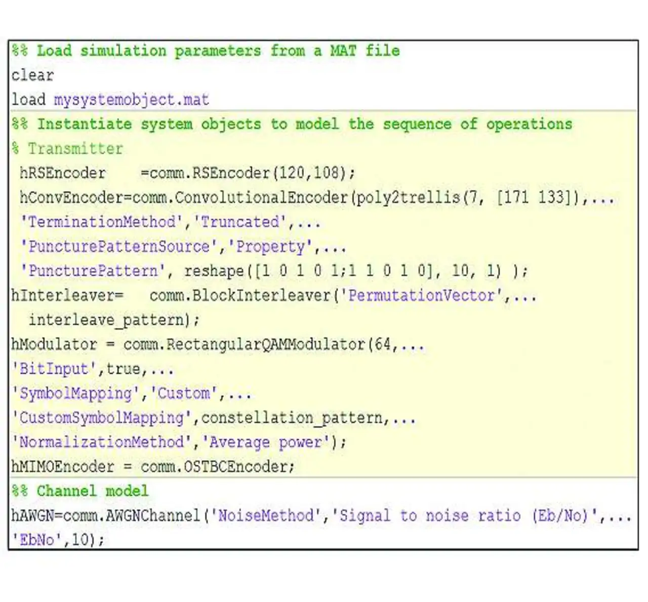 Für die Lösung der gleichen Aufgabe bedient sich Matlab-Code, wie in Bild 2 gezeigt, verschiedener vorgefertigter System-Objects aus dem »Signal Processing Blockset« (SPB) sowie dem »Communications Blockset« (CB). Zur Modellierung des Senders wählt der Entwickler hier aus dem CB die System-Objects für den Reed-Solomon-Encoder, den Faltungs-Encoder, den Block-Interleaver, den Rectangular-QAM-Modulator und den Orthogonal-Space-Time-Blockcodierer aus, die nacheinander instanziiert und aufgerufen werden.