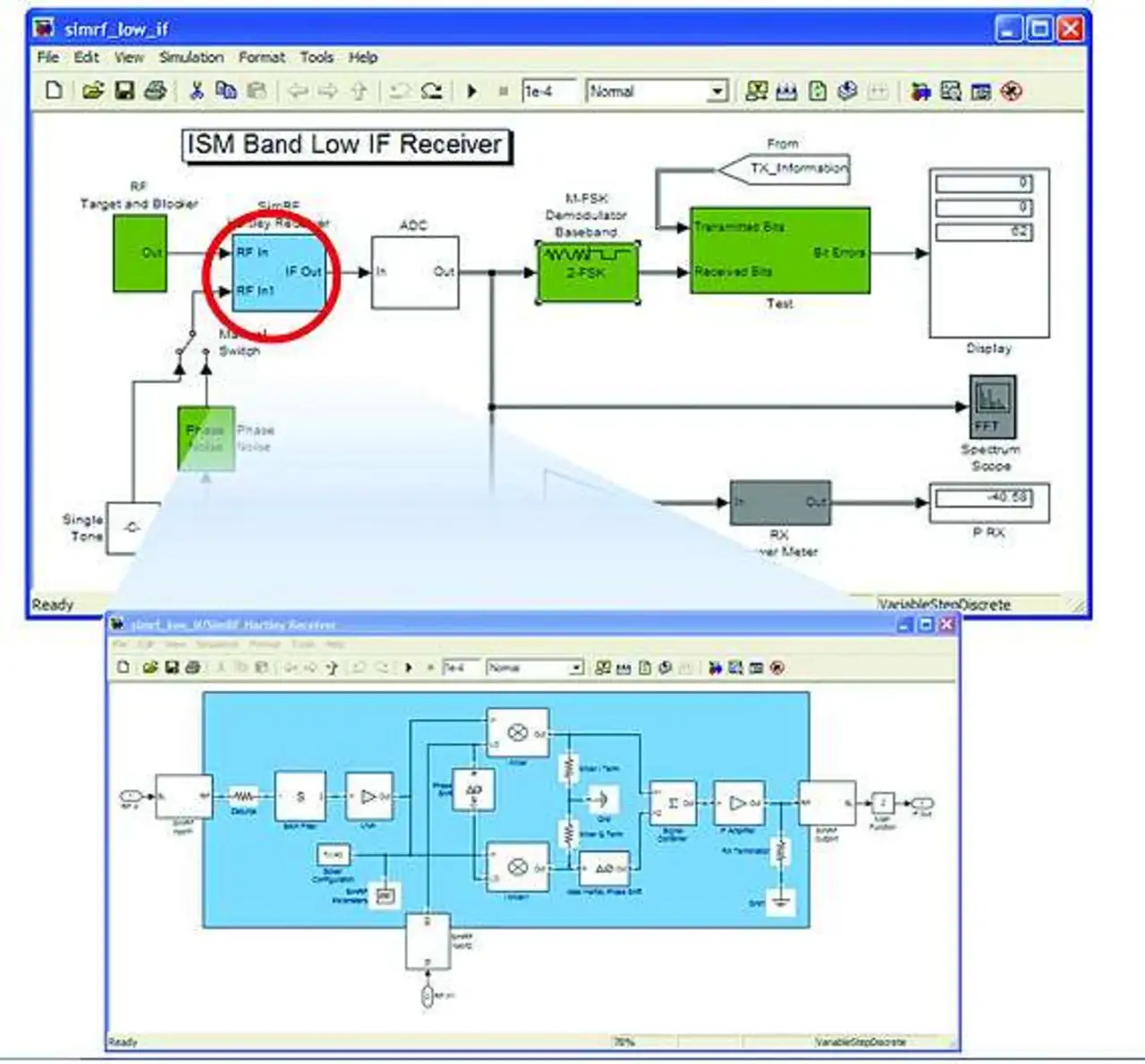 In dieser Umgebung können Systemarchitekten bereits zu Beginn des Entwicklungsprozesses realistische Simulationen durchführen und erhalten Hilfe bei Trade-off-Entscheidungen für Entwürfe, die digitale und analoge/HF-Komponenten nebeneinander enthalten. Bild 3 zeigt ein Systemmodell eines ISM-Empfängers (Industrial, Scientific and Medical) mit niedriger Zwischenfrequenz, das sowohl die Komponenten zur digitalen Signalverarbeitung als auch die für das HF-Empfänger-Subsystem enthält.
