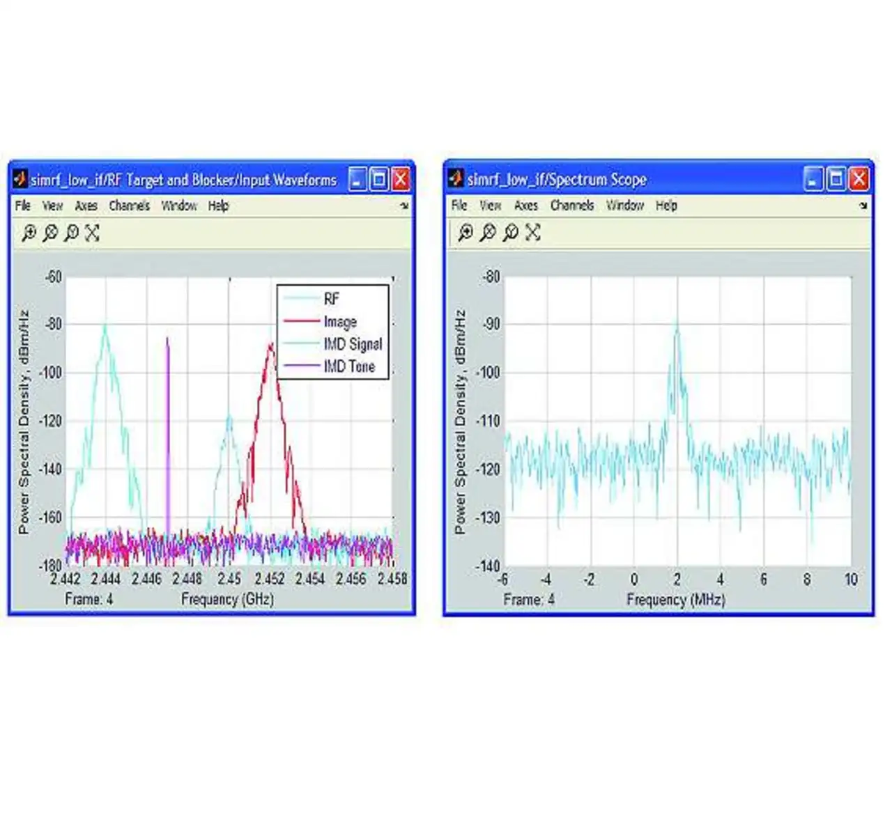 Das Modell nutzt außerdem die Simulation mit Circuit-Envelope-Methoden und unterstützt die Mehrfrequenz-Modellierung. Darüber hinaus können Systemarchitekten die Realisierbarkeit und die relativen Vorteile alternativer Methoden zur Unterdrückung von Spiegelfrequenzen wie etwa Superheterodyn- oder Direktmisch-Architekturen studieren (Bild 4).