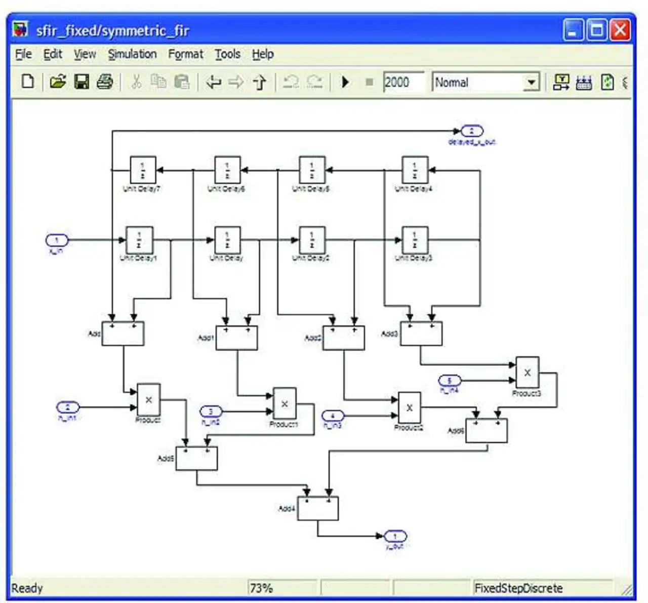 Bild 5 zeigt ein mit Festkomma-Arithmetik implementiertes symmetrisches FIR-Filter (Finite Impulse Response).