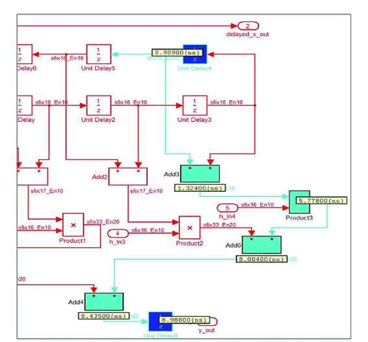 Bild 6 zeigt das Filter aus Bild 5, nur sind hier die kritischen Pfade automatisch hervorgehoben und mit den geschätzten Latenzen für jedes Pfadsegment versehen.