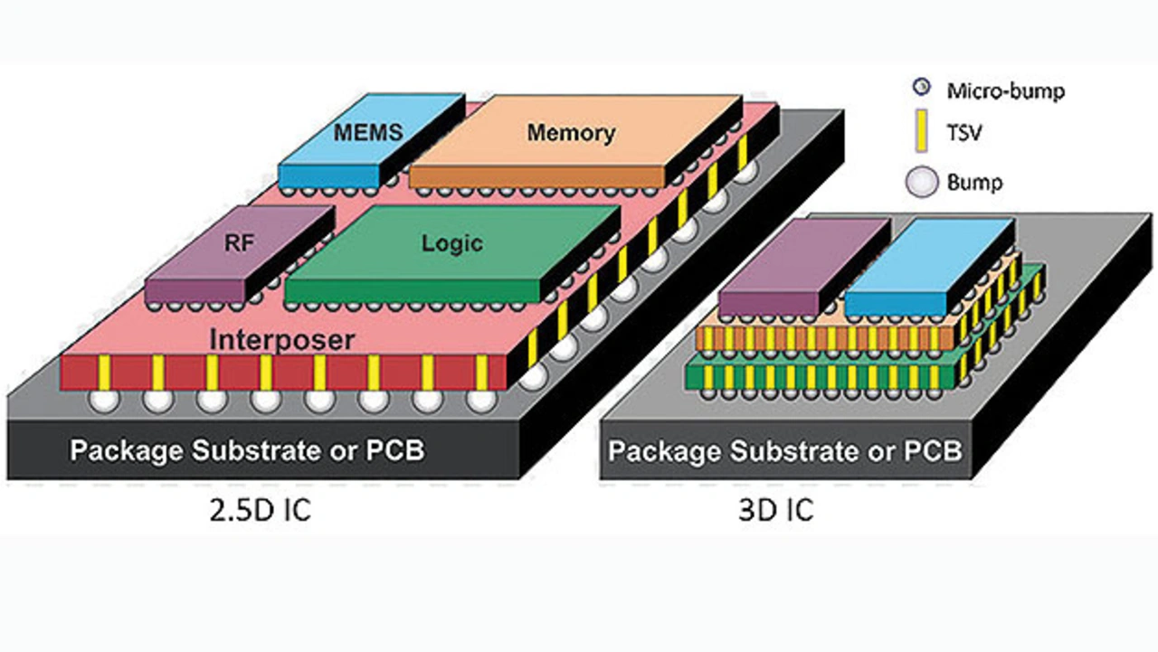 ! Medhat: Ja und Nein. Schauen wir uns zunächst den Aufbau der 2,5D-/3D-ICs genauer an: 2,5D-/3D-ICs haben sich für viele herausfordernde Integrationsaufgaben bewährt. 2,5D-ICs bestehen aus mehreren Dies, die nebeneinander auf einem passiven Silizium-Interposer angeordnet sind (Bild 1). Der Interposer wird auf einem organischen BGA-Substrat (Ball Grid Array) platziert. Mikro-Bumps verbinden jeden Die mit dem Interposer, und Flip-Chip-Bumps (C4) verbinden den Interposer mit dem BGA-Substrat. In 3D-ICs werden die Dies übereinander montiert. Zur Verbindung zwischen den Dies und zur Verbindung mit dem Substrat werden Through-Silicon Vias (TSV) verwendet.