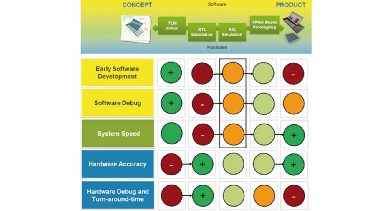 Im Gegensatz dazu erlaubt das virtuelle Prototyping eine Software-Entwicklung zum frühest möglichen Zeitpunkt. Das Software-Debugging ist hervorragend und schnell, aber die Hardware-Genauigkeit und ein detailliertes Debugging sind unpraktisch, wodurch eine Hardware-Verifikation unmöglich wird. Sobald im Design-Verlauf das Register-Transfer-Level-Modell (RTL) zur Verfügung steht, ist der Zeitpunkt für das Set-up und das Hardware-Debugging in der RTL-Simulation optimal. Schließlich gilt RTL heute auf Grund der Genauigkeit als die Referenz. Wegen der geringen Geschwindigkeit eignet sich die RTL-Simulation allerdings meist nicht für die Software-Entwicklung. Deshalb wollen die Anwender für die Hardware-Software-Verifikation Emulations- und Hardware-basierte Beschleunigungsplattformen nutzen. Diese ermöglichen eine höhere Geschwindigkeit, die zumindest für Subsysteme ausreicht. Außerdem wird das Software-Debugging jetzt praktikabler, obwohl es nun später im Ablauf als bei der RTL-Simulation stattfindet. Hinzu kommen die große Hardware-Genauigkeit und gute Zeit für das Set-up, so dass ein Design schneller an die Emulations- und Beschleunigungs-Engines weitergegeben werden kann.