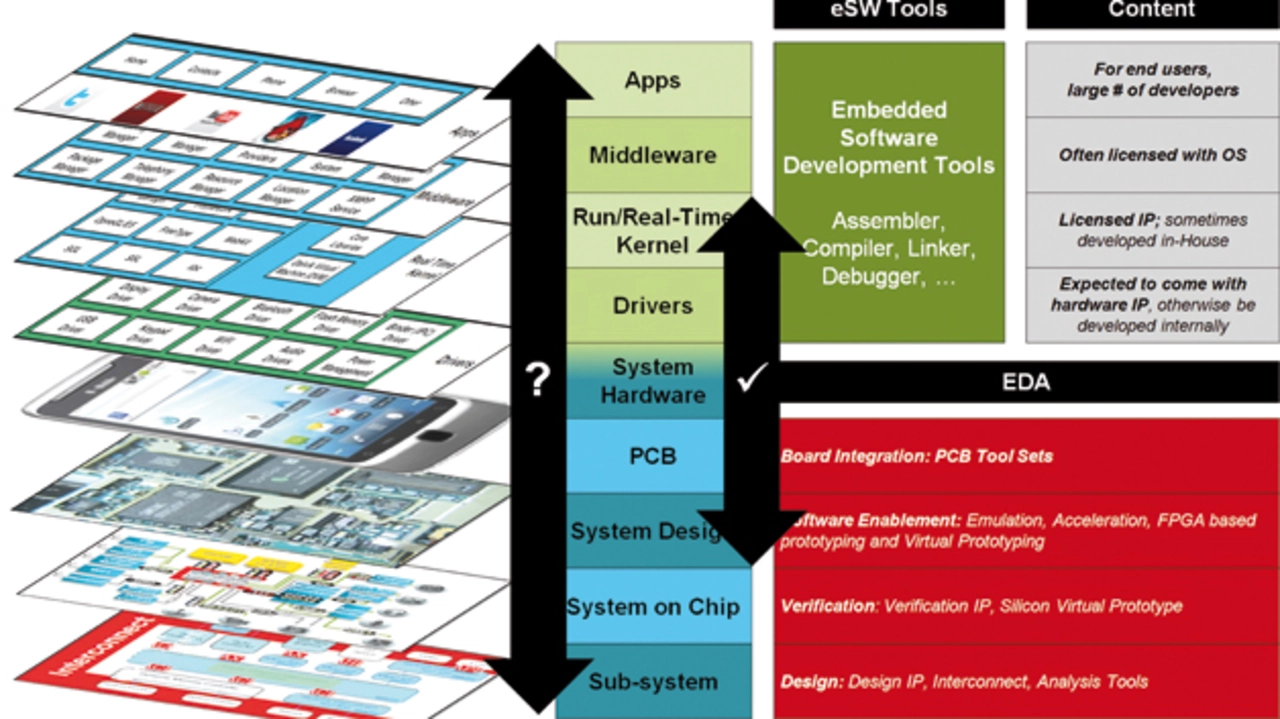 Bild 3 zeigt einen Hardware/Software-Stack und stellt einige der heute verfügbaren EDA- und Embedded-Software-Tools den verschiedenen Komponenten eines Systems gegenüber. Wie die vertikalen Pfeile zeigen, kann EDA heute die Treiber und Betriebssysteme mit der zugehörigen Hardware gut zusammenbringen.