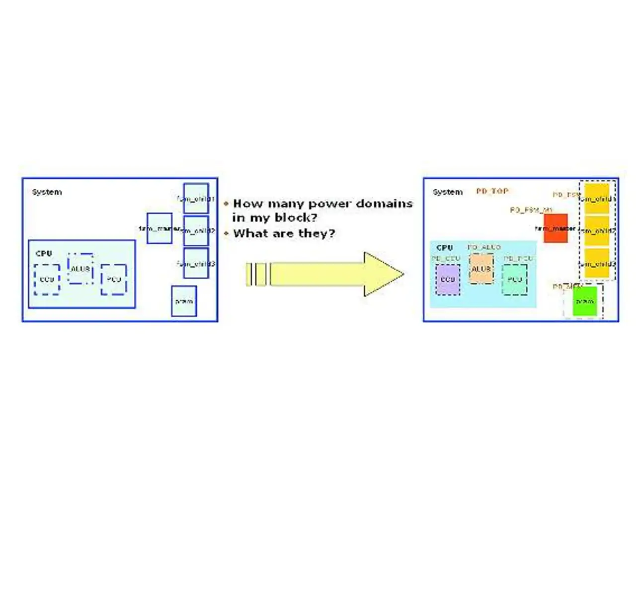 Nicht selten wird die Aufgabe, UPFund CPF-Spezifikationen zu erstellen, den System- und Chip-Level-Designern übertragen. Ein nicht beteiligter RTL-Ingenieur kann dann die Auswirkungen der Spezifikationen auf das Block-Level-Design nicht ohne weiteres nachvollziehen. Ein Subblock in einem hierarchischen RTL-Design kann beispielsweise mehrere Spannungsinseln beinhalten, die jeweils unterschiedlichen Regeln für das Ein- und Ausschalten der Spannungsversorgung unterliegen. Für jede Insel gelten wiederum individuelle Vorschriften für die dort verwendeten Pegelumsetzer sowie Gatter zur Isolation und Erhaltung von Signalen. Eine so geartete Schaltung zeigt in einer Simulation, die Power-Aspekte berücksichtigt, ein Verhalten, das sich von dem einer Schaltung unterscheidet, bei der es nicht auf den Stromverbrauch ankommt und bei der daher alle Elemente während des Betriebs eingeschaltet bleiben. Letzteres war bislang der Normalfall für RTL-Ingenieure. Es ist daher besonders wichtig, dass ihnen das Verständnis der Power-Merkmale eines Blocks erleichtert wird, an dem sie arbeiten sollen. Angenommen, ein RTL-Entwickler arbeitet an einem CPU-Block, wie er in Bild 1 zu sehen ist, und er will wissen, zu welchen Spannungsinseln dieser mit seinen untergeordneten Blöcken gehört. Im Falle der Beispielschaltung würde er feststellen, dass der CCU-Subblock der Domäne PD_CCU, der Subblock ALUB der Domäne PD_ALUB und der Subblock PCU der Domäne PD_PCU zugeordnet ist.