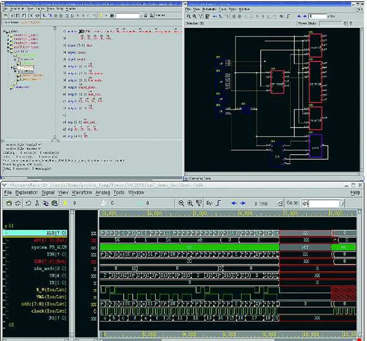 ■■ Eine UPF/CPF-basierte Darstellung, sodass sich die spezifizierten Power-Elemente wie Schaltregeln, Regeln für Retention-und Isolationszellen sowie Pegelumsetzer leicht lokalisieren lassen. Eine Annotation der Power-Merkmale in RTL-, Schaltplan- und Wellenform-Darstellungen, mit deren Hilfe der Anwender die Power-Merkmale mit den zugehörigen Designblöcken korrelieren kann. Dadurch kann er bestimmen, welche Blöcke zu welchen Spannungsinseln gehören und welche Signale zur Erhaltung eines Signalwertes oder als Pegelumsetzer für eine Spannungsinsel dienen.