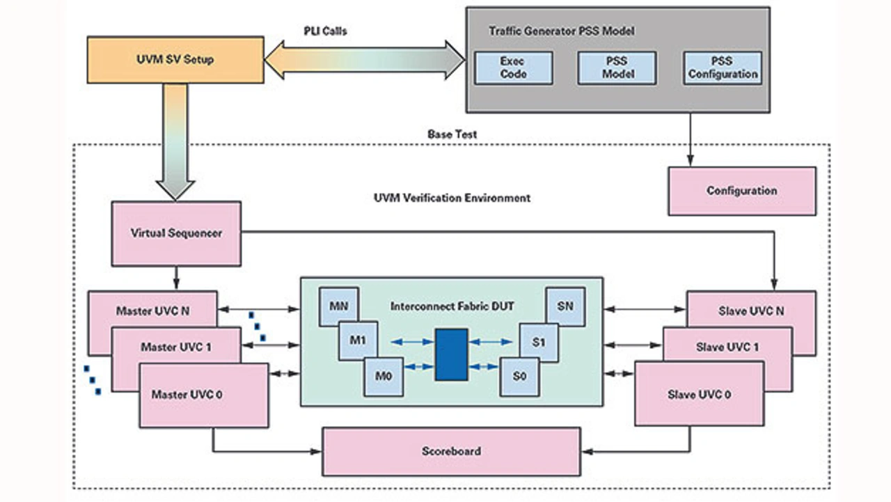 Die Umgebung wird über einen UVM-Test auf der obersten Ebene gesteuert, der auf der einen Seite die virtuellen Sequenzen aufruft, um den UVC-Betrieb zu steuern. Auf der anderen Seite interagiert sie über PLI- oder DPI-basierte (DPI, Direct Programming Interface) Systemaufrufe mit dem vom portierbaren Stimulus generierten Format. Das PSS-basierte Modell wird im SystemC-basierten Prozess zur Leistungsmodellierung vollständig wiederverwendet. Die vom PSS-basierten Modell generierte Testlogik steuert alle Operationen zwischen den UVCs. Die Simulationen auf IP-Ebene nutzen die generierten Tests und erfassen die Abdeckung.