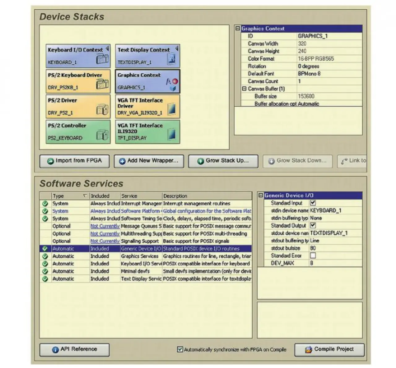 Das Embedded-Projekt besteht aus einem C-Modul sowie einem Software-Platform-Builder-Dokument. Der C/C++-Compiler für den TSK3000 ist im Altium Designer enthalten. Nachdem das Embedded-Projekt mit dem FPGA-Projekt „verheiratet“ wurde, können nun im Software-Platform-Builder mittels einer „Import from FPGA“-Funktion die benutzten Peripherie-Komponenten importiert werden. Hiernach werden die im FPGA-Projekt erkannten Komponenten der untersten Ebene, also die Hardware-Wrapper für den PS/2-Controller sowie das VGA-TFT-Display, angezeigt.
