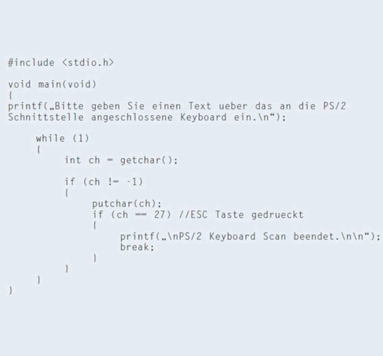 Hier erscheint also eine kurze Anweisungsausgabe auf dem TFT-Display, und anschließend können Testeingaben über das PS/2-Keyboard gemacht werden. Wird die ESC-Taste betätigt, so beendet dies das Programm.