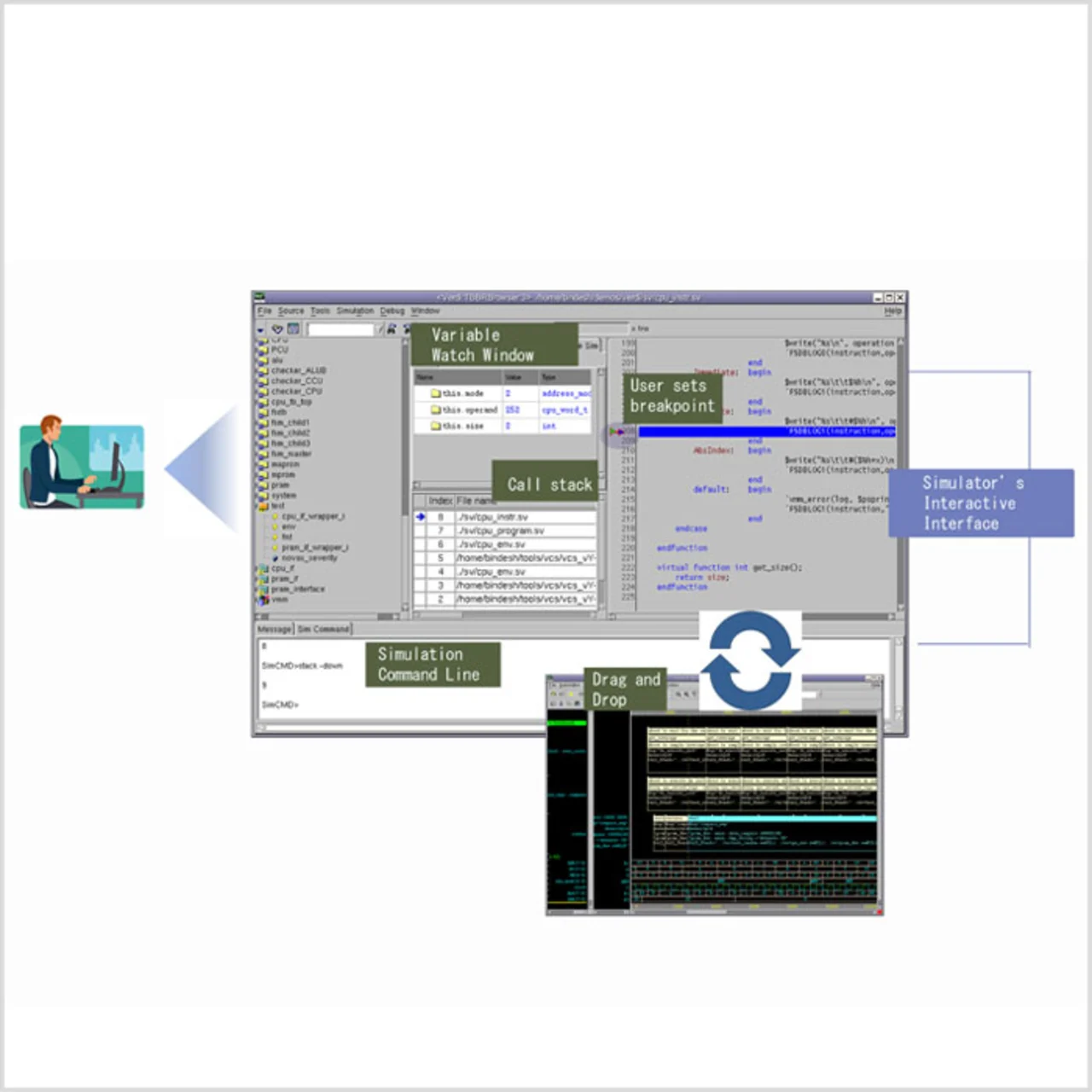 Eine interaktive Simulation ist häufig der einzig verfügbare Mechanismus, der einen tieferen Einblick in den Testbench-Code gewährt. Während das Protokollieren einen recht groben High-Level-Überblick über die Testbench-Aktivitäten vermittelt, liefert eine interaktive Simulation von Testbenches GDB-ähnliche Daten, die zum Verständnis des Testbench-Verhaltens erforderlich sind. Dazu gehören Werte von Variablen zu einem bestimmten Zeitpunkt und detaillierte Informationen zum Thread. Die meisten Simulatoren haben im interaktiven Modus üblicherweise einen wenn auch einfach gehaltenen Zugriff auf diese Informationen.