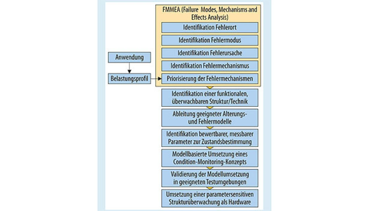 Zur Integration einer applikationsspezifischen Zustandsüberwachung in elektronische Systeme müssen die Wechselwirkungen der Aufbau- und Verbindungstechnik in ihrer derzeitig und zukünftig relevanten Variantenvielfalt mit den Komponenten, dem Gehäuse des Systems und dem Belastungsprofil am Einbauort analysiert und bewertet werden. Diese Analysen bilden die Grundlage um Schwachstellen in der Konstruktion auf Systemebene zu identifizieren, Fehlermechanismen zu bewerten und die Restlebensdauer zu überwachen. Der Ablauf nach Bild 7 hat sich bei der Entwicklung eines der¬artigen Systems etabliert.