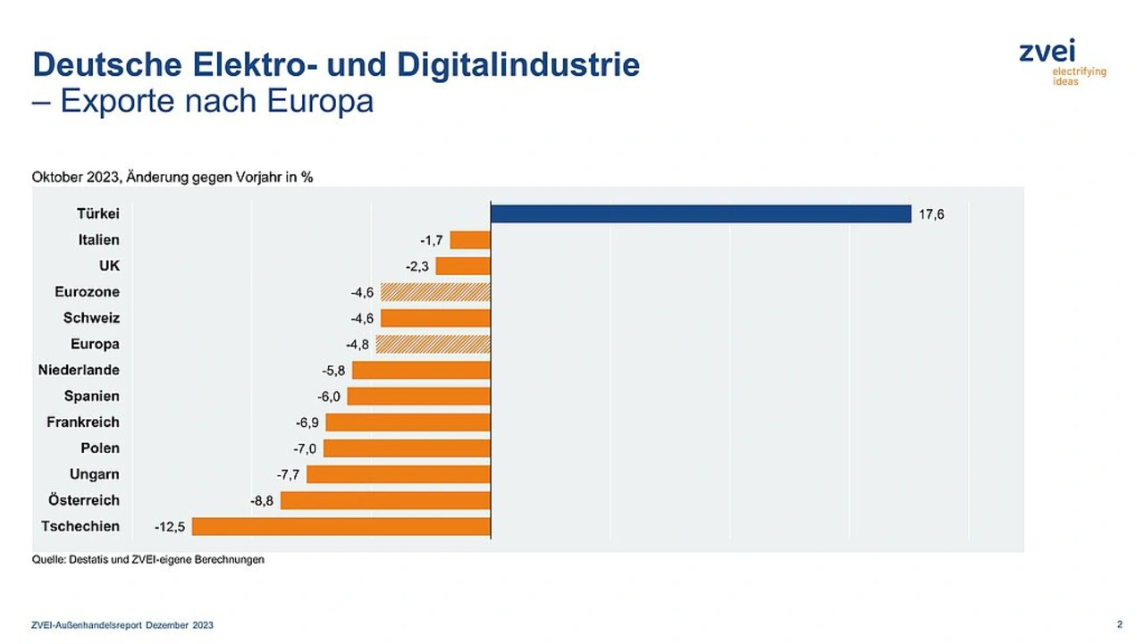 Die Elektroausfuhren nach Europa sind im Oktober 2023 um 4,8 Prozent gegenüber Vorjahr auf 12,6 Milliarden Euro zurückgegangen. Die Lieferungen allein in die Eurozone gaben dabei in gleicher Größenordnung nach, nämlich um 4,6 Prozent auf 6,6 Milliarden Euro.