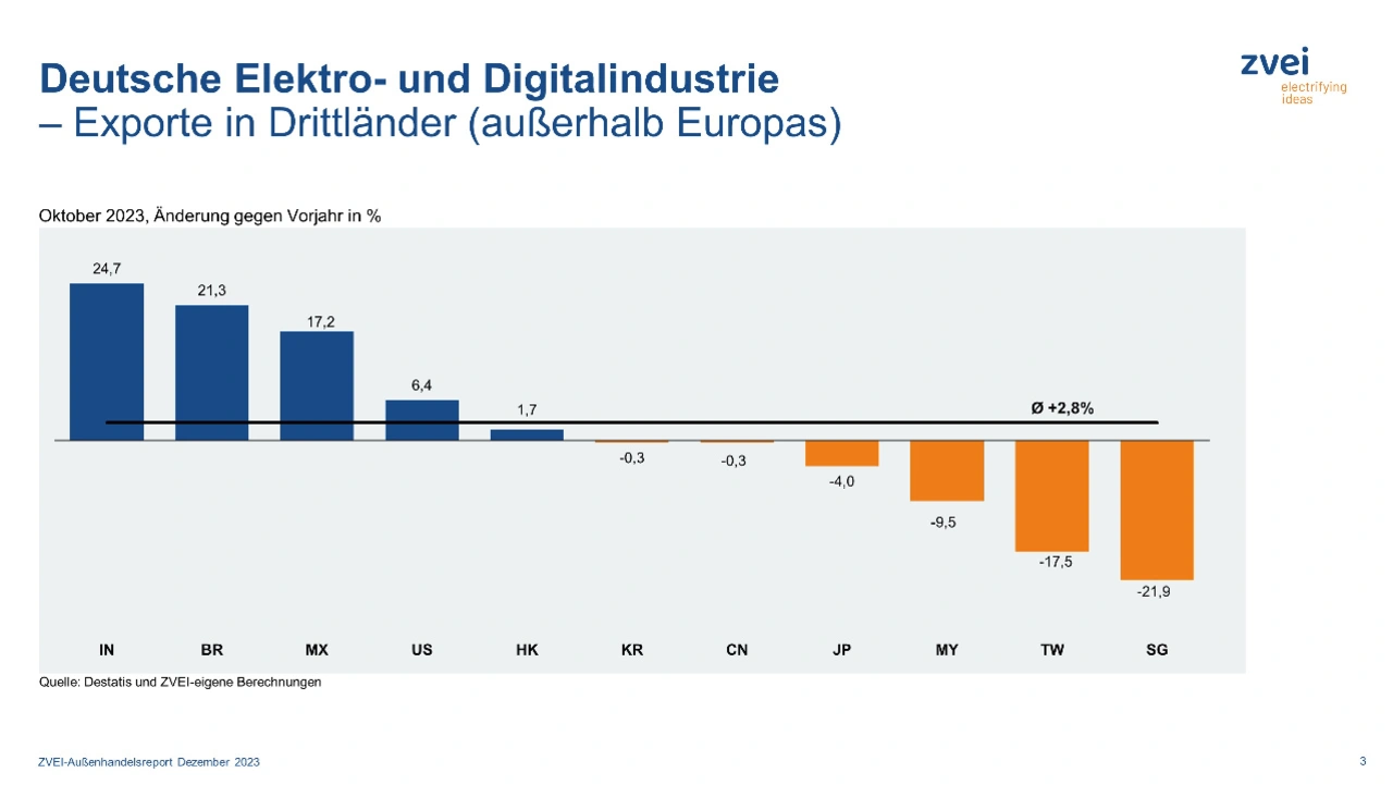 Die Elektroausfuhren in die Länder außerhalb Europas zogen im Oktober 2023 um 2,8 Prozent gegenüber Vorjahr auf 7,9 Milliarden an.