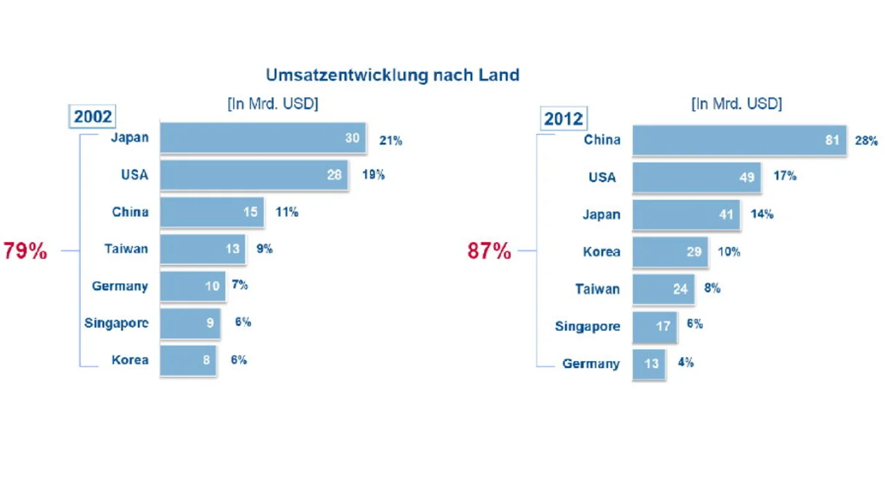 Interessant sind die Verschiebungen innerhalb einzelner Länder in den letzten 10 Jahren: In 2012 wurden 90 % aller Halbleiter in nur 7 Ländern verbaut, Deutschland ist von Platz 5 auf Platz 7 gefallen (Bild).
