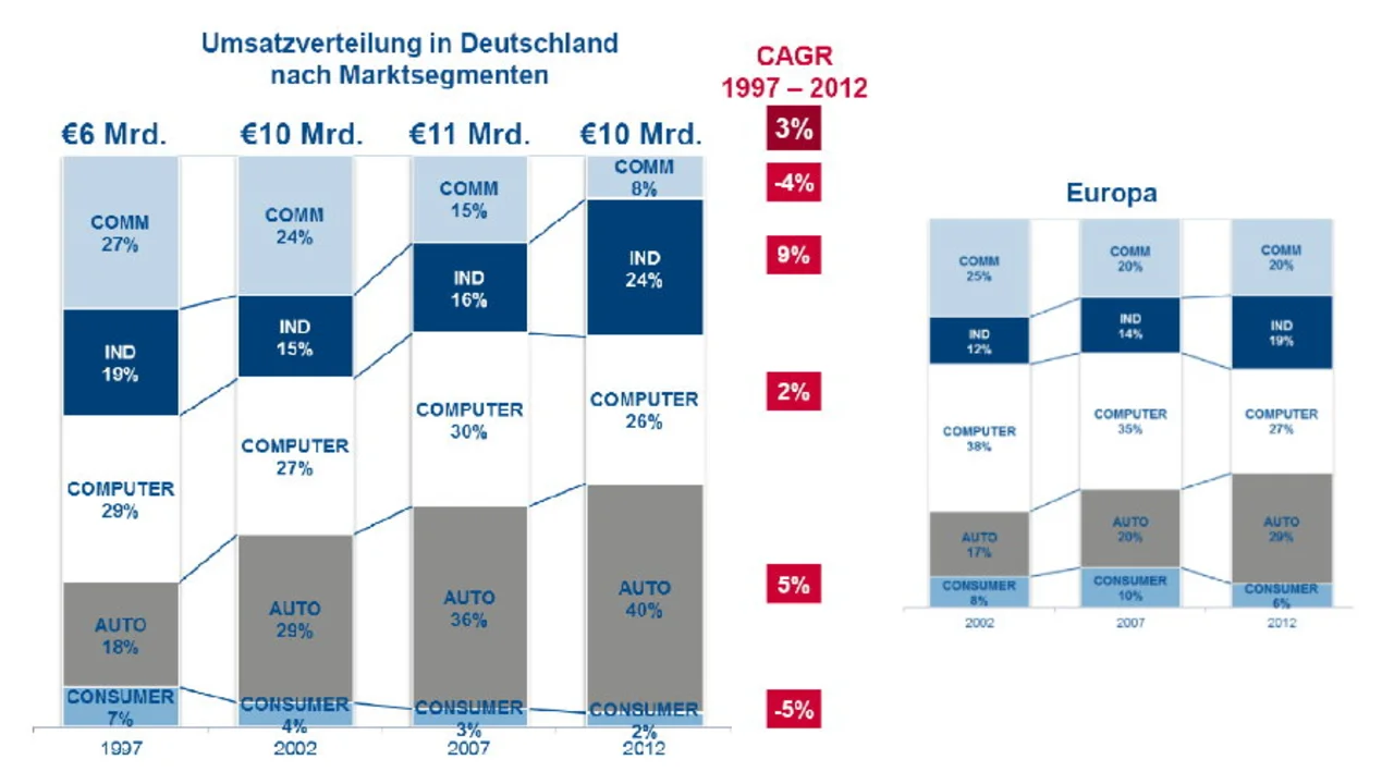 In Deutschland sieht das Bild auf den ersten Blick überraschend aus: Immerhin noch 26 % des Gesamtumsatzes wird im Bereich Computertechnik erzielt, sicherlich eine Folge von vielen hier ansässigen EMS-Firmen. Getragen wird der Markt allerdings von der Automobil-Branche, welche 40 % des Umsatzes generiert. Die Industrie steht für 24 % (wächst allerdings mit rund 9 % pro Jahr am schnellsten), die Kommunikation (8 %) und Kosumgüter (2 %) spielen in Deutschland keine Rolle mehr.