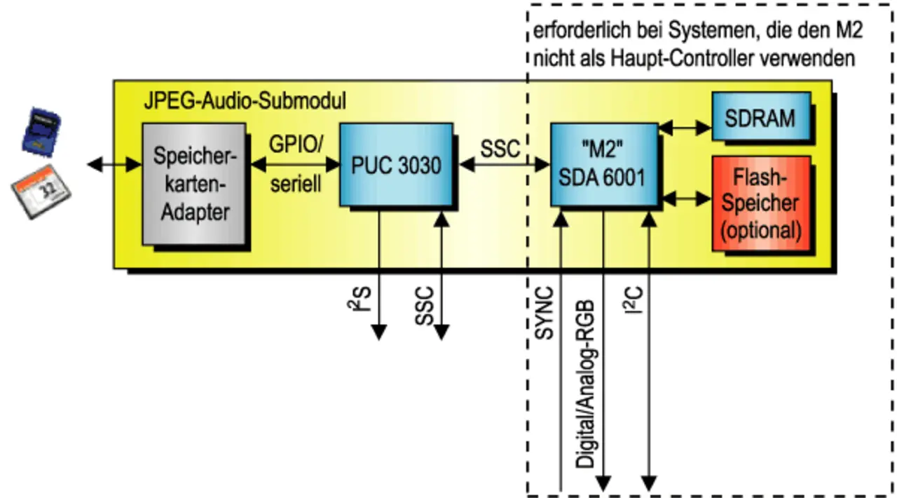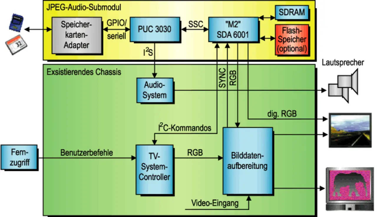Lediglich zwei Chips sind erforderlich, um digitale Fotos zu decodieren und darzustellen: der 32-bit-Controller vom Typ PUC 3030A und der Grafik-Controller vom Typ SDA 6001 (M2). Diese beiden Chips können platzsparend auf einem Modul integriert werden, das die TV-Hersteller in ihre Geräte einbauen (Bild 1).