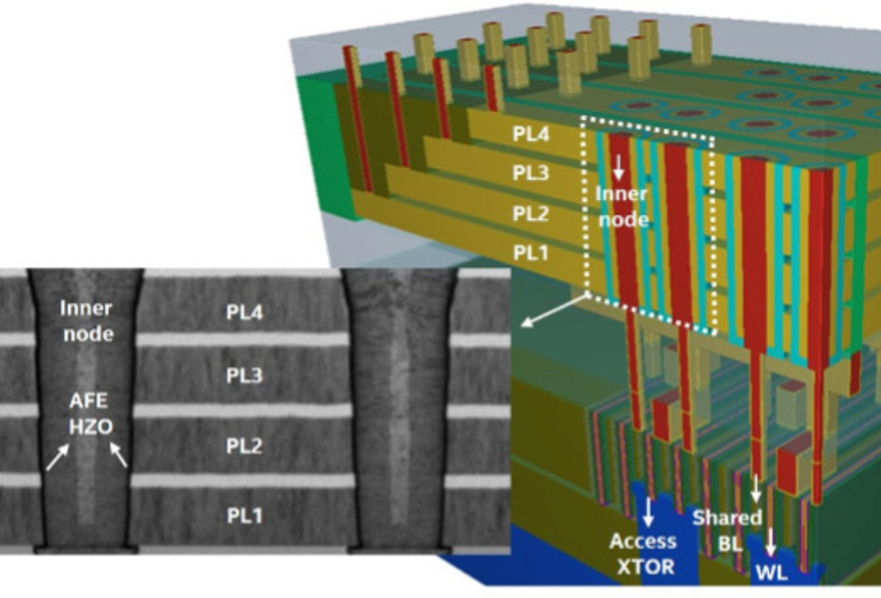 Intel-Forscher stellten ihre Arbeit vor, bei der sie das antiferroelektrische (AFE) Material Hafnium-Zirkonium-Oxid (HfZr02) verwenden, um einen 3D-Kondensator mit tiefem Graben für den möglichen Einsatz in eingebetteten DRAM-Speichern herzustellen. Er zeigte eine Lebensdauer von 10 bis 12 Zyklen selbst bei hohen Temperaturen und eine Betriebsspannung von 1,8 V. Die Forscher verwendeten diese AFE-Kondensatoren in einer neuartigen Speicherarchitektur für ultrahohe Bitdichten: ein vertikaler Stapel, der auf einem Zugriffstransistor mit mehreren parallel geschalteten AFE-Kondensatoren basiert. Jeder Kondensator repräsentiert ein einzelnes Speicherbit. Durch das vertikale Stapeln von vier AFE-Kondensatoren konnte eine signifikante Erhöhung der Dichte erreicht werden, ohne dass die Fläche vergrößert wurde (Paper 28.1).