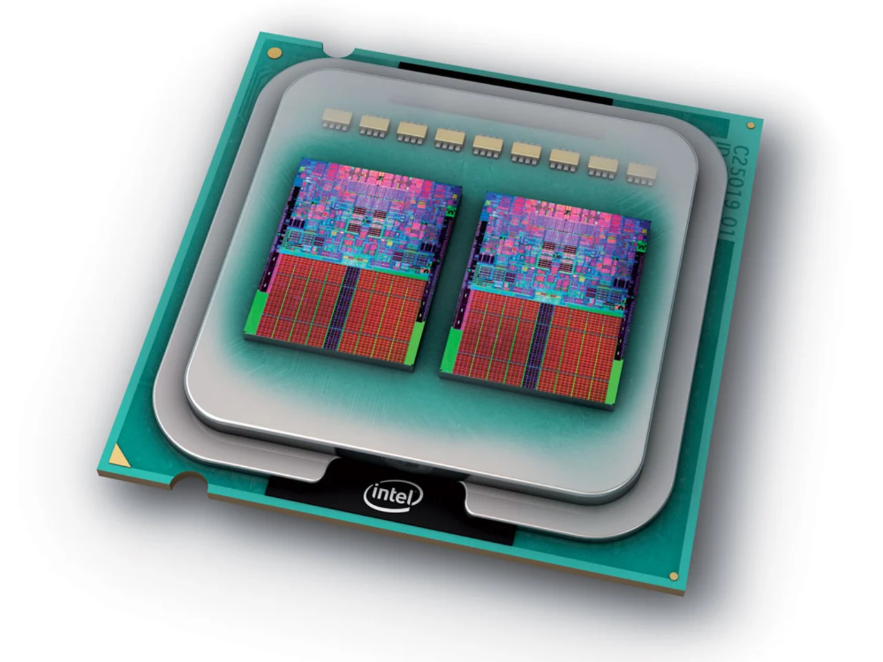 Der Desktop-Prozessor Q6600 verfügt über vier Kerne der neuen Core-Mikroarchitektur, die mit jeweils 2,4 GHz getaktet sind. Allerdings sind diese vier Kerne nicht monolithisch integriert, sondern als zwei separate Dies in einem Prozessorgehäuse des Typs LGA775 untergebracht. Jeder der beiden 143 mm2 großen, in einem 65-nm-Prozess gefertigten Dies integriert rund 291 Mio. Transistoren, die auf zwei Rechen-Cores und 4 Mbyte an „Advanced Smart Cache“ verteilt sind. So verfügt der Q6600 insgesamt über 8 Mbyte L2-Cache. Der Front-Side-Bus ist mit 1066 MHz getaktet, und die Leistungsaufnahme gibt der Hersteller mit 130 W (wie bei der „Extreme“-Version) an. Für den Massenmarkt dürfte der Q6600 mit 851 Dollar bei 1000 Stück noch zu teuer sein.