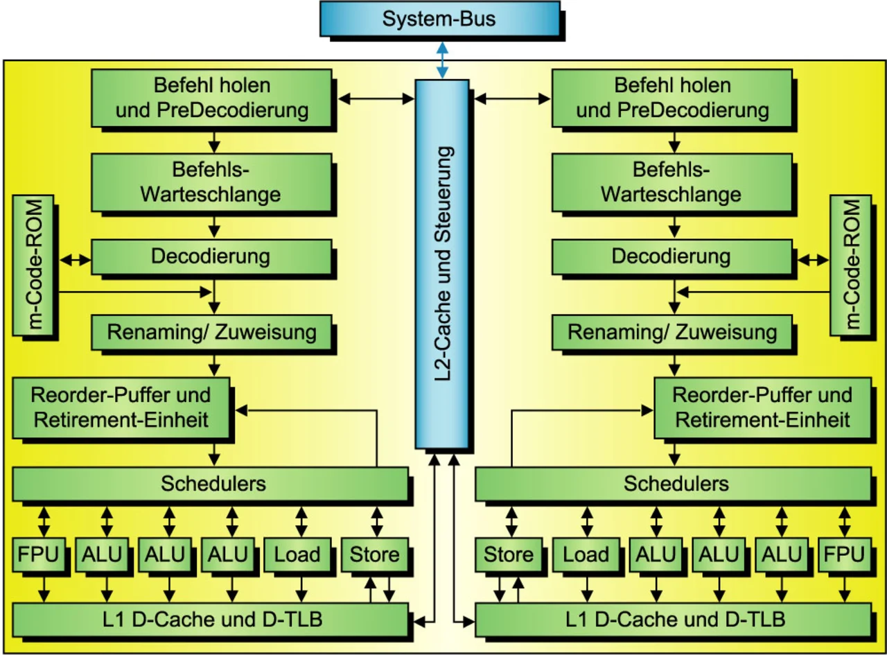 Smart Memory Access: Befehle werden spekulativ bereits vorausschauend ausgeführt, obwohl die verwendeten Daten aus dem Speicher möglicherweise ungültig sind. Um zu vermeiden, dass viele dieser Ausführungen wiederholt werden müssen, verfügt die Core-Architektur über eine Funktion, die die Wahrscheinlichkeit von Speicherkollisionen im voraus berechnen kann.