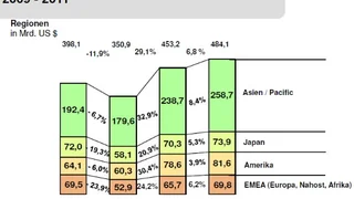 Ursache für die Erholung der Märkte ist unter anderem der rasant gestiegene Bedarf nach Komponenten in den Segmenten Industrie- und Kfz-Elektronik sowie das Ende der generellen Investitionszurückhaltung in den Industrieländern. Die gestiegene Nachfrage nach Komponenten für die Nutzung regenerativer Energien – wie Wind- und Solarenergie – trägt im Bereich der Industrie-Elektronik zum satten Umsatzplus bei. Auch der deutliche Nachfrageanstieg in der Region Asien/Pazifik hat zur Markterholung beigetragen. Mit einem Umsatzplus von rund 33 Prozent auf 239 Mrd. US-Dollar im Jahr 2010 dürfte die Region das stärkste Wachstum aufweisen.